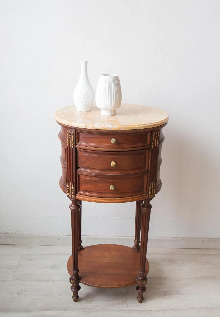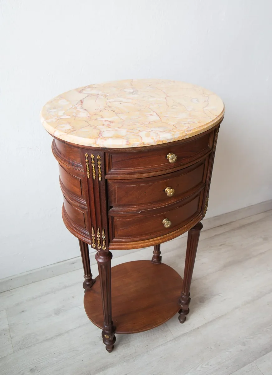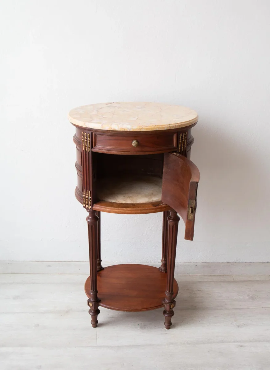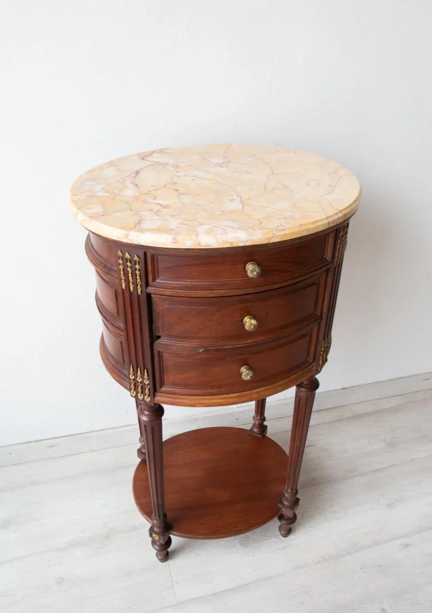 Lo más llamativo de esta antigua mesita de noche francesa, de aprox. 1900, aparte de sus formas redondeadas y sus detalles de latón es su peso. Pesa cerca de 20 kilos ya que tiene el interior forrado de mármol blanco y también cuenta con un sobre de mármol rosáceo. Tiene un cajón superior y un hueco debajo. VENDIDA