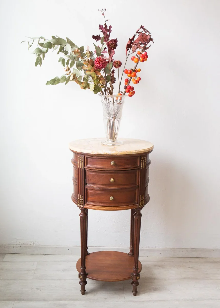Hemos limpiado a fondo la madera y el mármol, limpiado los apliques y detalles de latón, y dado un toque de cera natural para que luzca como ves en las fotos. Se ve de una gran calidad.