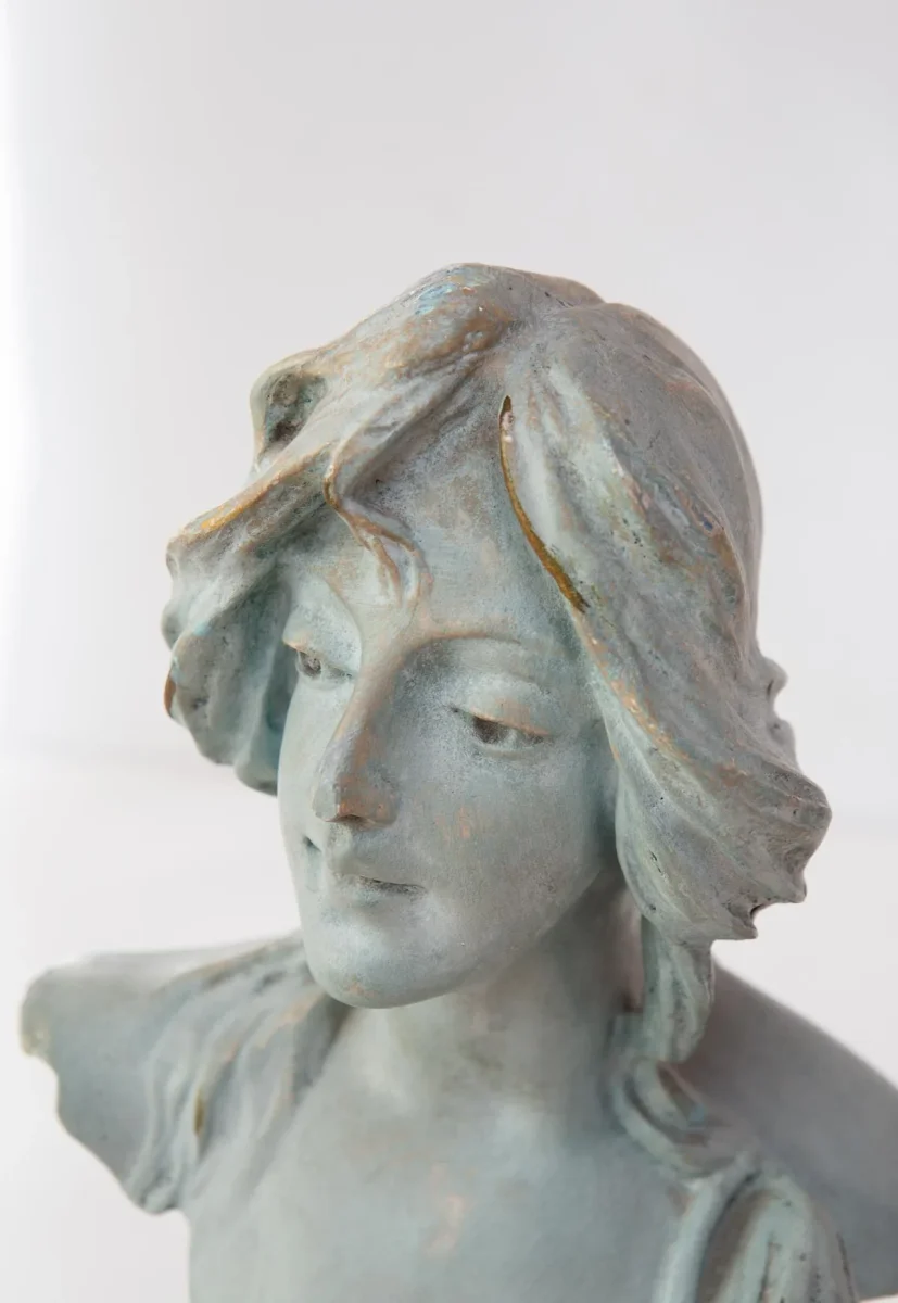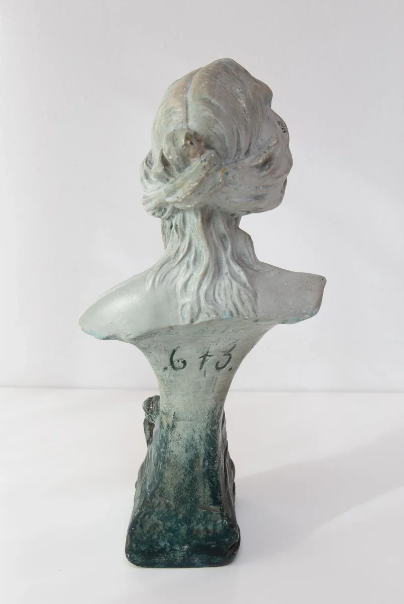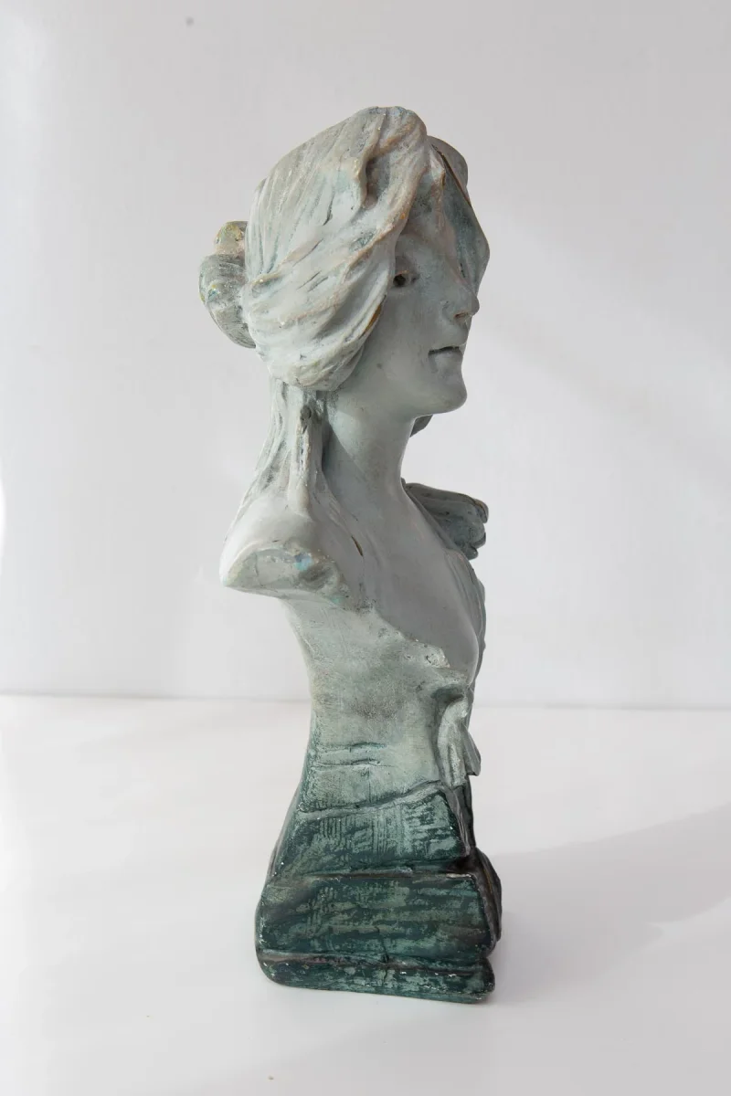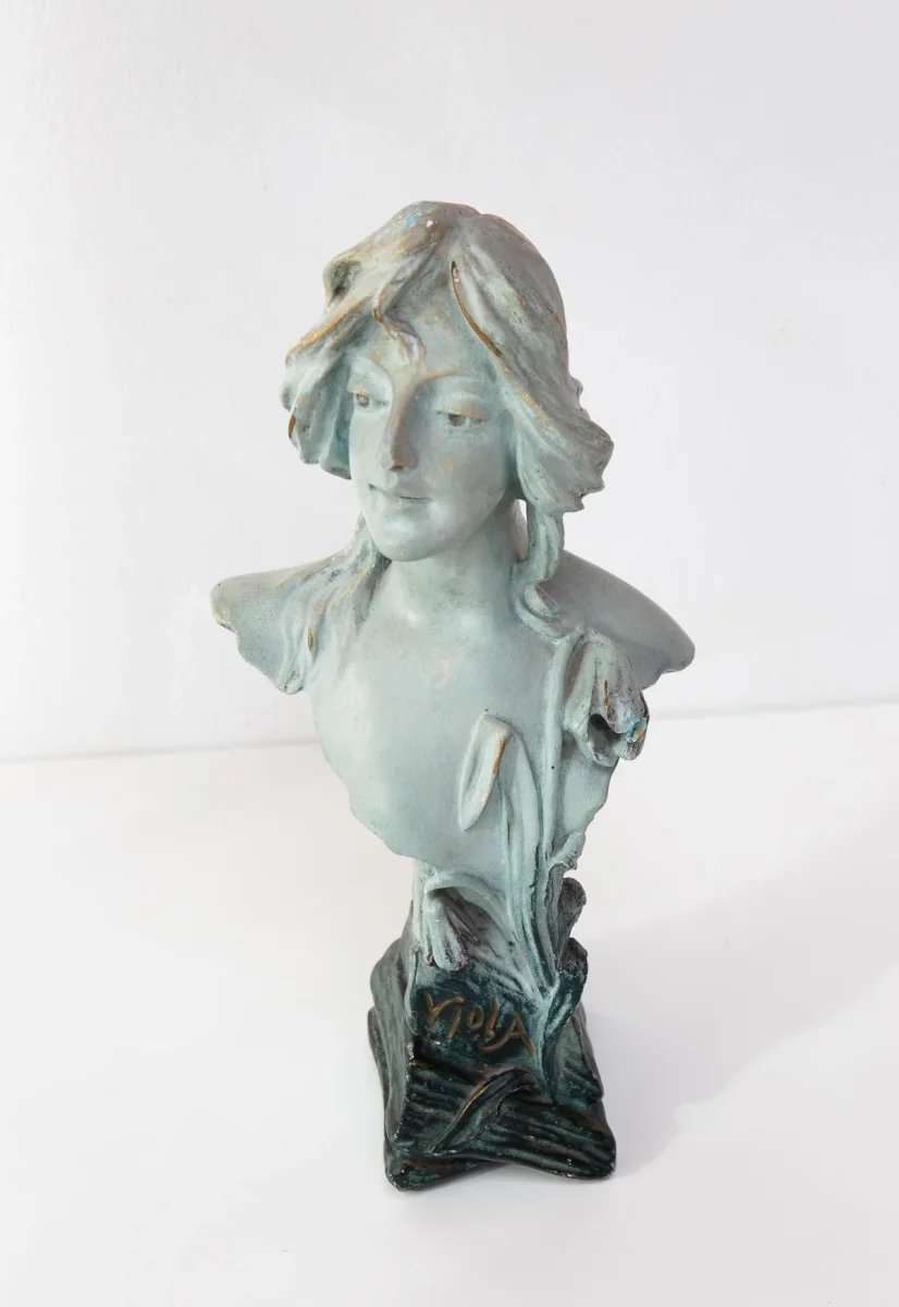 Plaster art nouveau bust of a young woman called Viola. France early 20th century. Blue original color. Dimensions: H 37 cm, L 18 cm, D 13 cm. We ship worldwide. Shipping costs will be added at checkout.