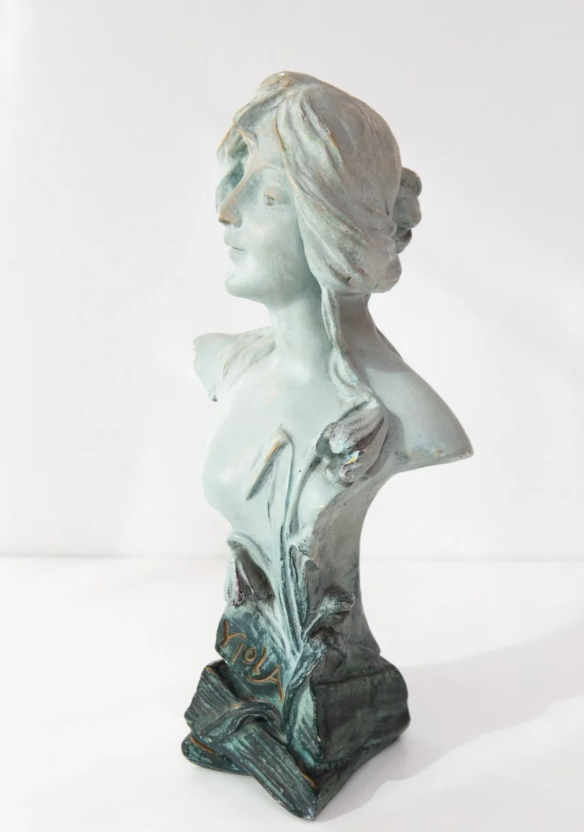 Antiguo busto francés de estilo y época art nouveau de escayola que representa una joven llamada «Viola». El color azul con detalles ocre/dorado es el original de la pieza