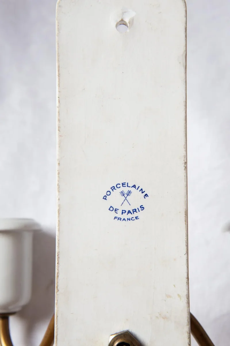 French wall lights. Porcelaine de Paris c. 1900. For 2 bulb type E14. PRICE PER UNIT. ONE AVAILABLE. One socket on each wall light has a crack . Dimensions: H 23 cm, L 20 cm, D 11 cm . We ship worldwide. Shipping costs will be added at checkout.