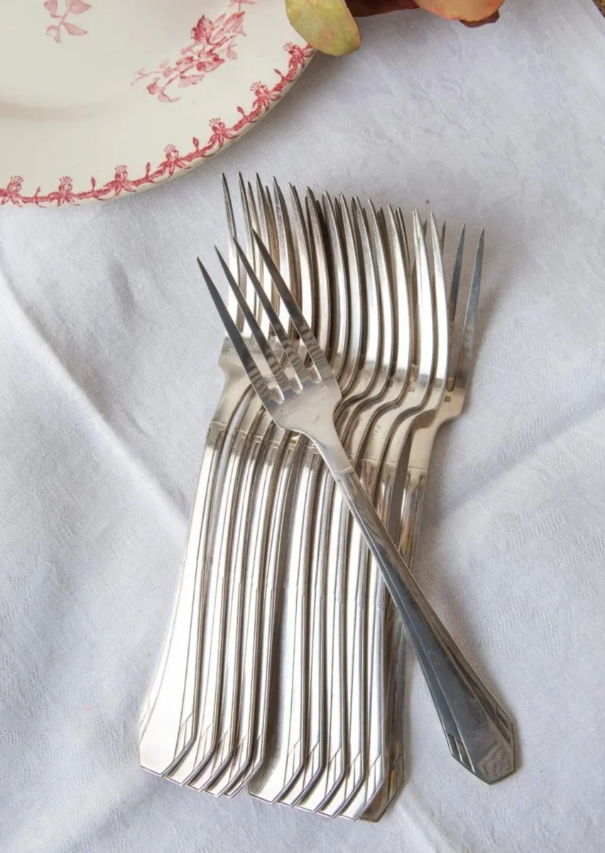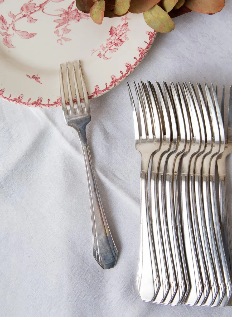 Juego de tenedores en metal plateado de la firma Orbrille. Son de estilo y época art decó (años 20/30) y están fantásticos. VENDIDOS