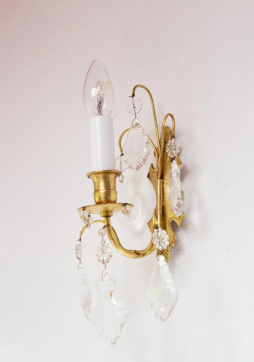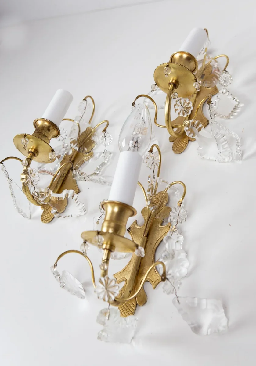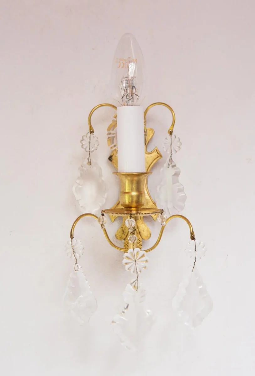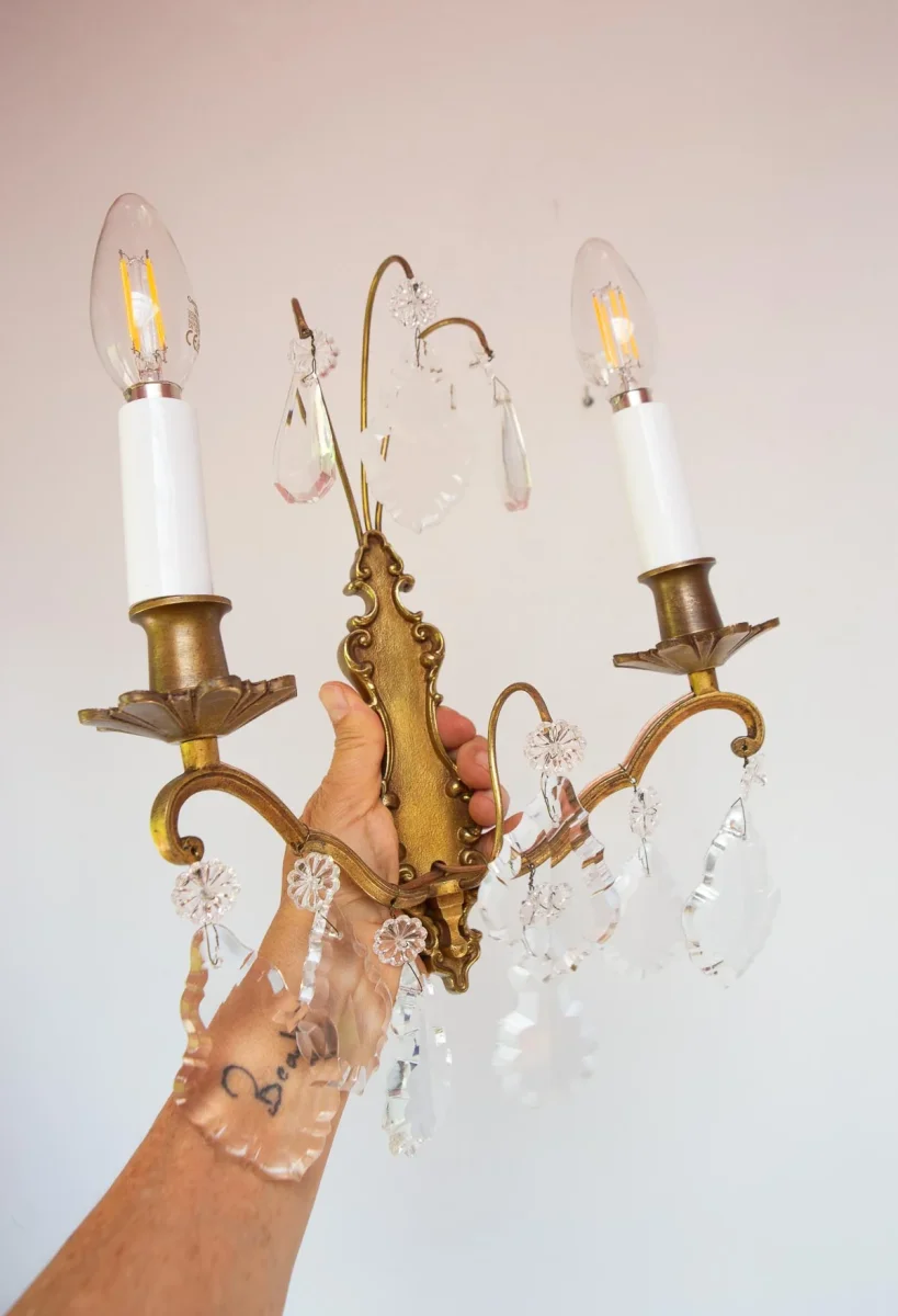 Antiguos apliques franceses de latón con cristales. Son de mediados del s. XX. PRECIO POR UNIDAD. 3 DISPONIBLES. Los hemos desmontado completamente para su limpieza y reelectrificación. Los cables son nuevos.
