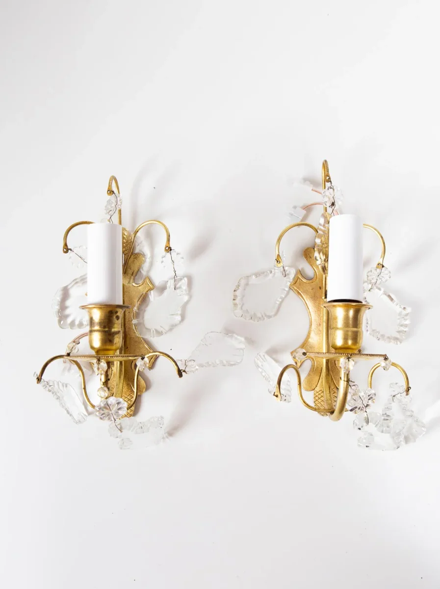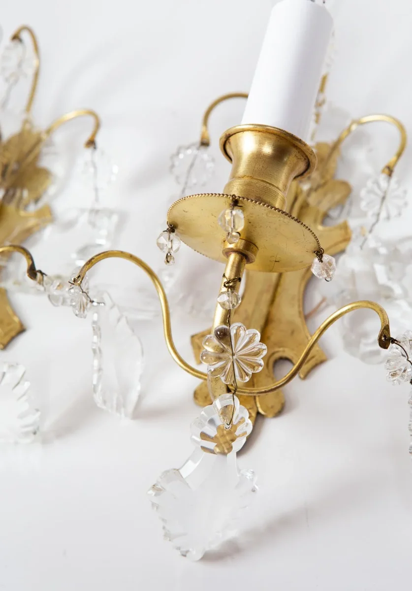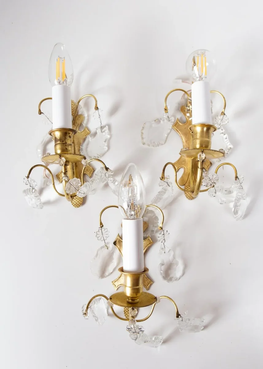 Antiguos apliques franceses de latón con cristales. Son de mediados del s. XX. PRECIO POR UNIDAD. 3 DISPONIBLES. Los hemos desmontado completamente para su limpieza y reelectrificación. Los cables son nuevos.