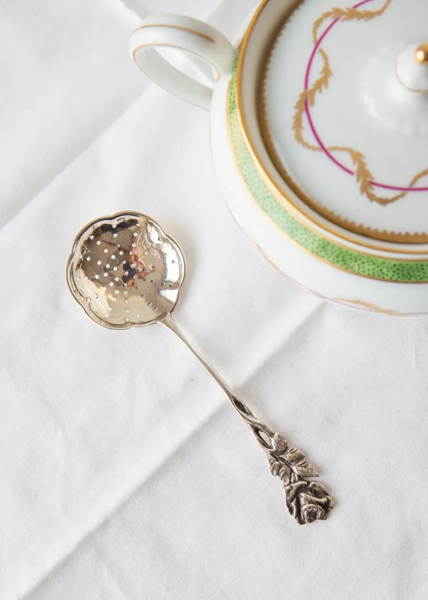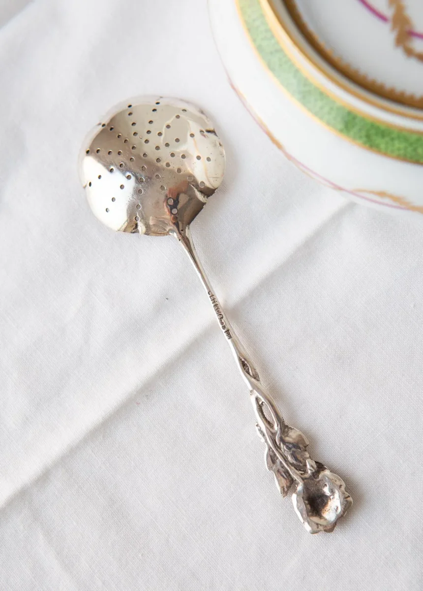 Delicada cucharilla espolvoreadora de azúcar elaborada en plata maciza sueca. Su diseño destaca por un mango escultórico con motivo de rosa en relieve y una cazoleta calada con delicados orificios, ideal para espolvorear azúcar o cacao.