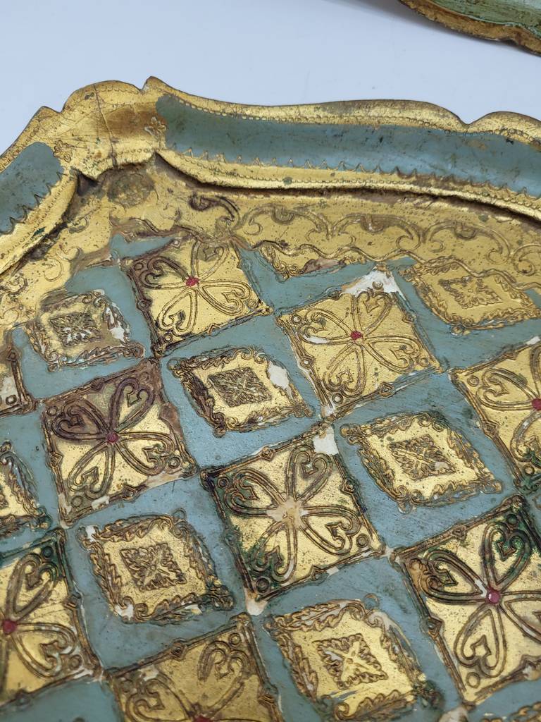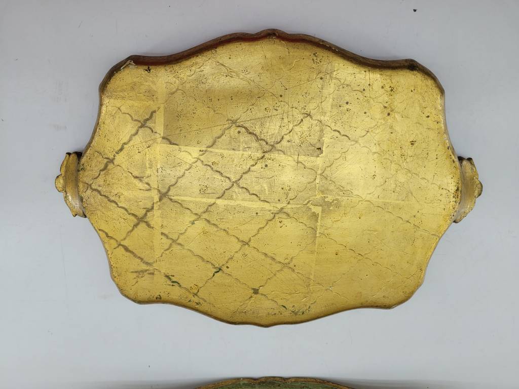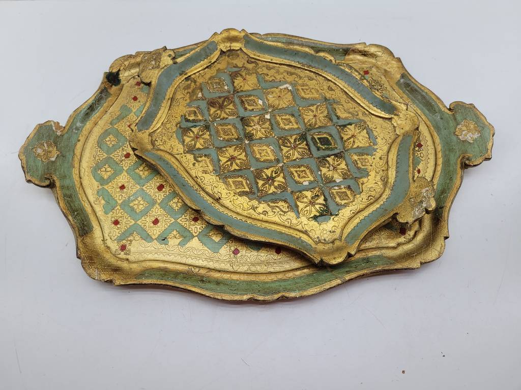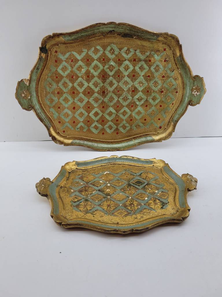 Pareja formada por dos bandejas de madera de buena calidad de color dorado. Se trata de dos bandejas, una más grande que la otra, que cuentan con dos extremos para sujetarlas con mayor facilidad. Son unas bandejas muy bonitas perfectas para tenerlas en el hogar y servir comida en ellas. Como se puede observar en las fotografías se encuentran en buenas condiciones.