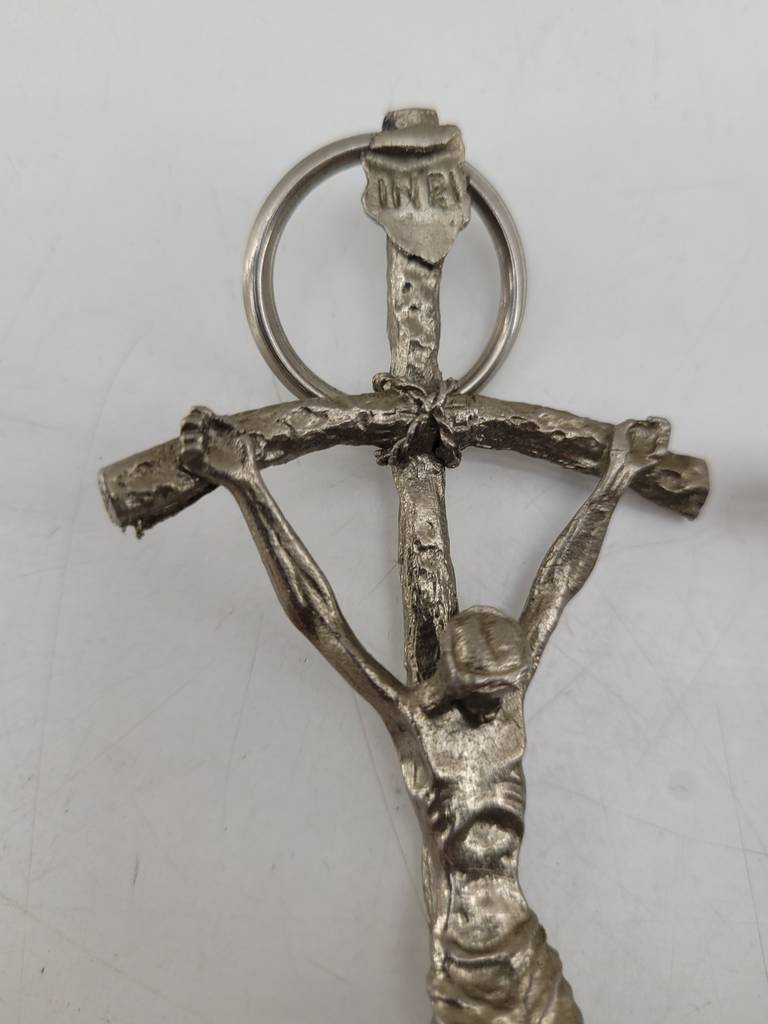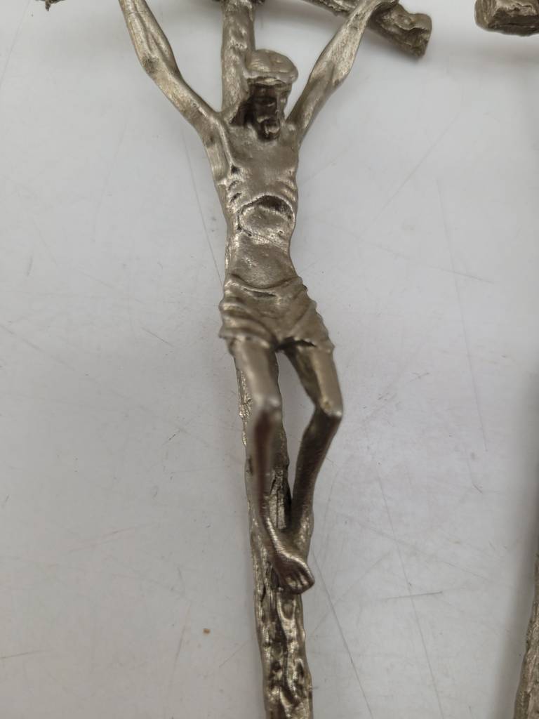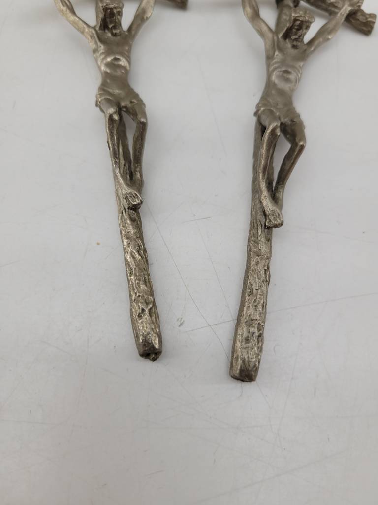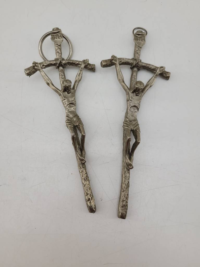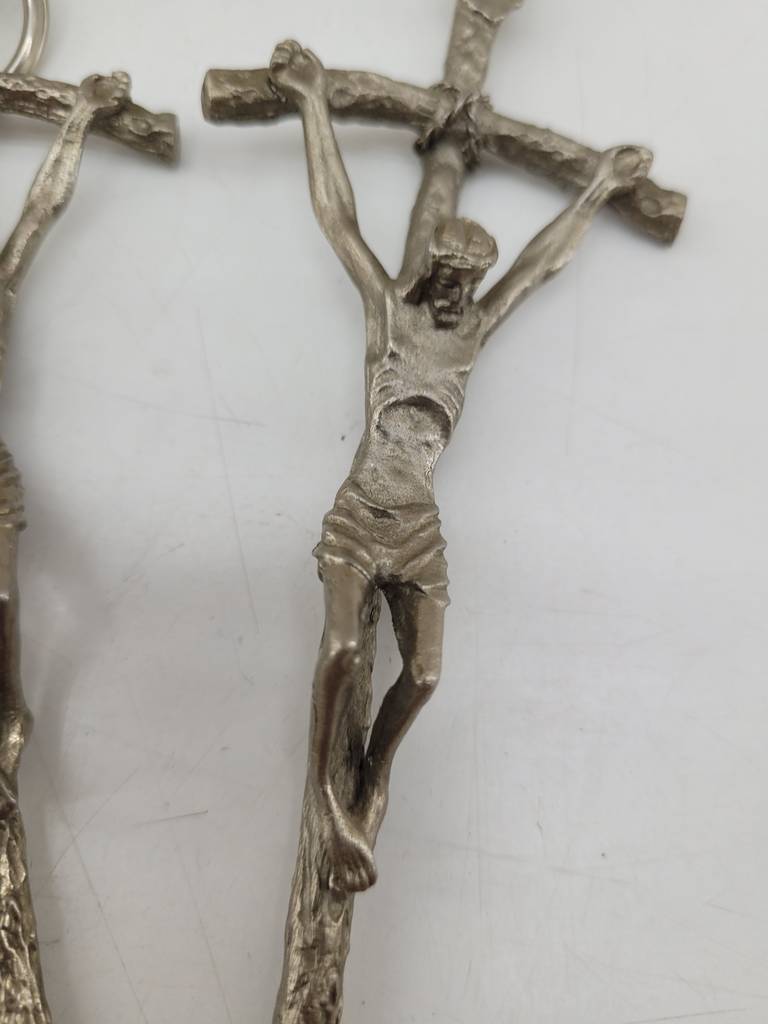Pareja de crucifijos pastorales realizados en metal de buena calidad. Se trata de unos crucifijos con la figura de Jesucristo con su corona de espinas en la cruz que han sido realizadas con mucha precisión y detalle. Es un producto religioso de buena calidad. Son unas piezas ideales para colocar en una pared en un recibidor o salón comedor, así como también para tener en colecciones privadas. Como podemos observar en las fotografías se encuentran en buenas condiciones.