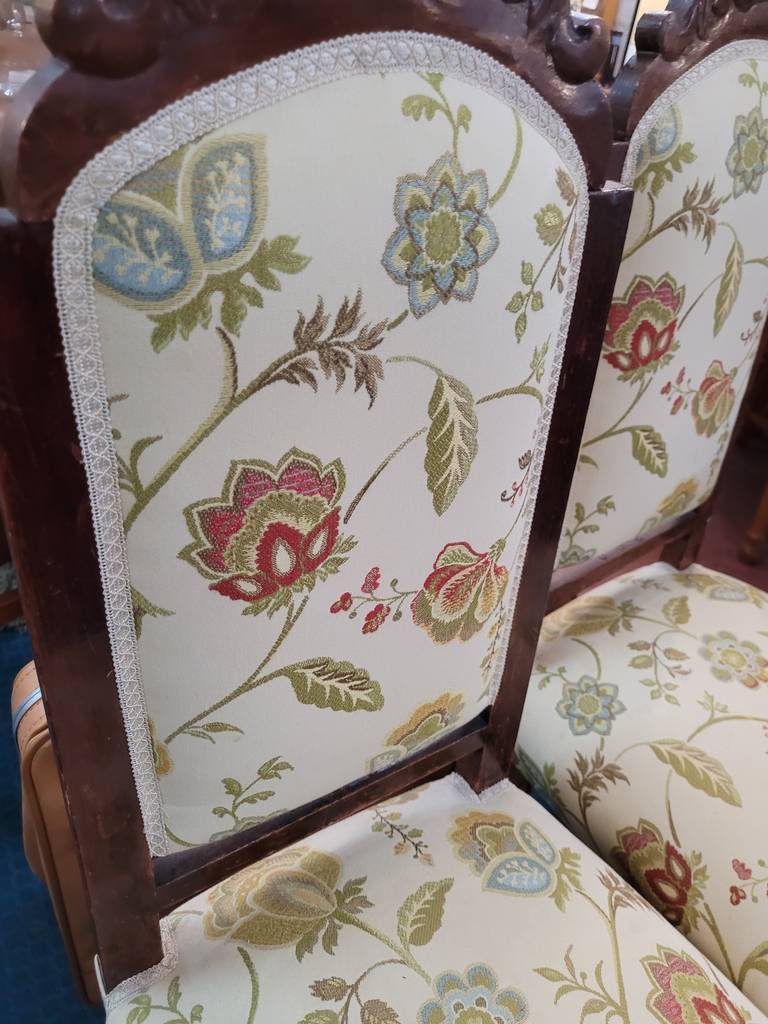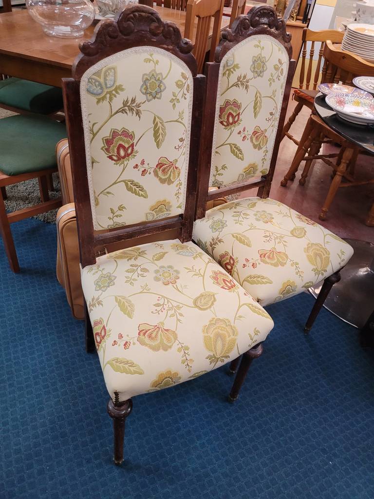 Pareja de sillas de estilo clásico y elegante con una estructura fabricada en madera de buena calidad y robusta. Incorporan un asiento y respaldo acolchado y cómodo así como un tapizado con flores y hojas en colores muy agradables que las hace resaltar. Son ideales para colocar en un salón comedor alrededor de una buena mesa. Como podemos observar en las fotografías presentan rasguños.