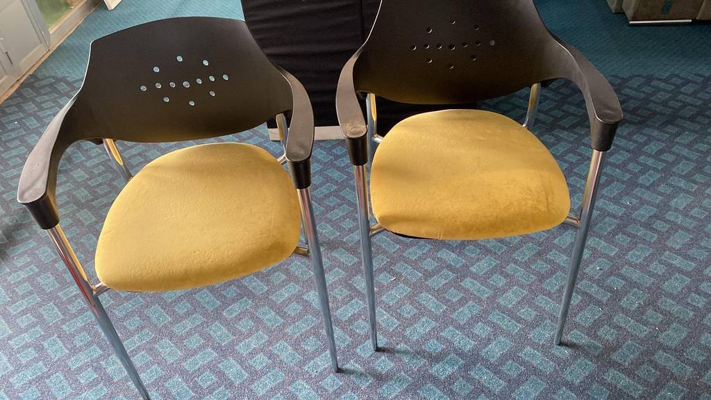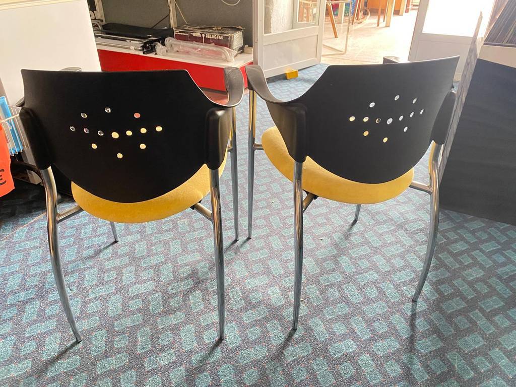 Pareja de sillas de auditorio modelo Ergo muy bonitas y originales con un asiento cómodo y mullido en color amarillo. También dispone de un respaldo de plástico que conforma también los reposabrazos en una única pieza de plástico duro. Es una silla ideal para colocar en un salón comedor o también en una oficina o despacho, por ejemplo. Como podemos observar en las fotografías se encuentran en buenas condiciones.