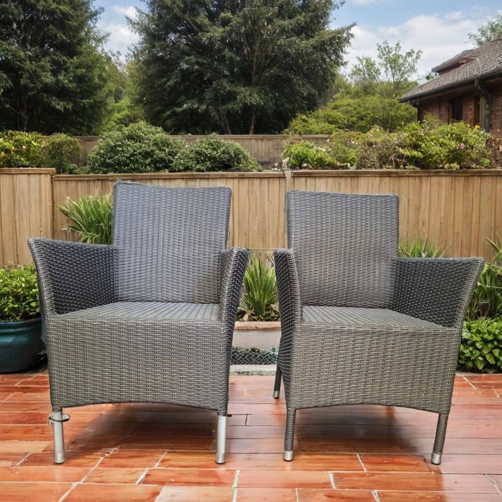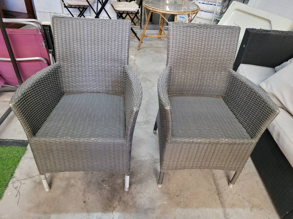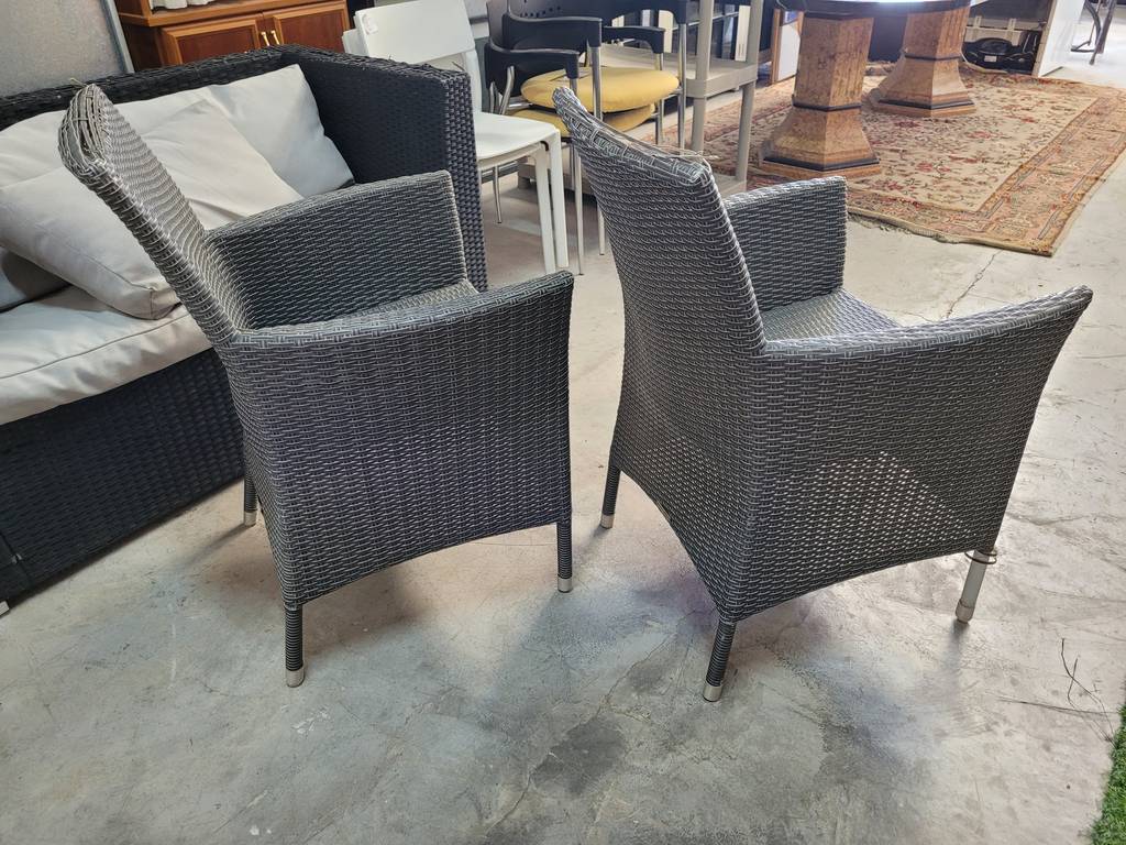 Pareja formada por dos sillones de exterior fabricados en metal y rafia de color gris oscuro. Se trata de dos sillones que cuentan con cuatro patas metálicas robustas y tienen dos reposabrazos y un respaldo muy confortables. Son dos sillones ideales para colocarlos en una zona exterior del hogar. Como se puede observar en las fotografías se encuentran ligeramente deteriorados.