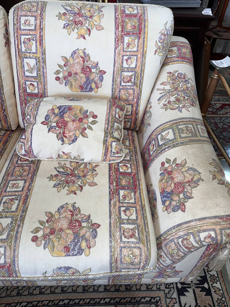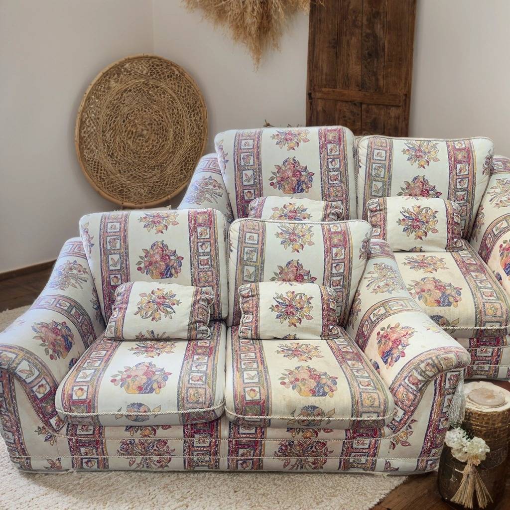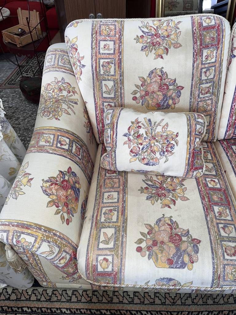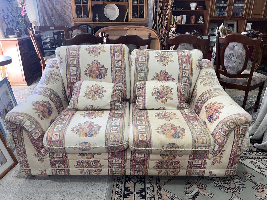 Pareja formada por dos sofás de dos plazas con una tela tapizada con adornos de rayas verticales anchas y flores. Se trata de dos sofás medianos de dos plazas que cuentan con dos mullidos asientos y dos cómodos reposabrazos. Son dos sofás perfectos para ponerlos ambos en un salón comedor amplio. Como se puede observar en las fotografías a los sofás les falta una buena limpieza.