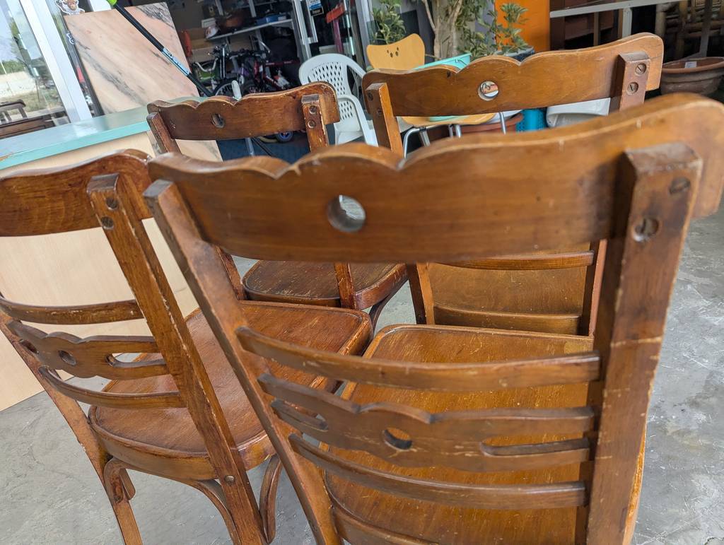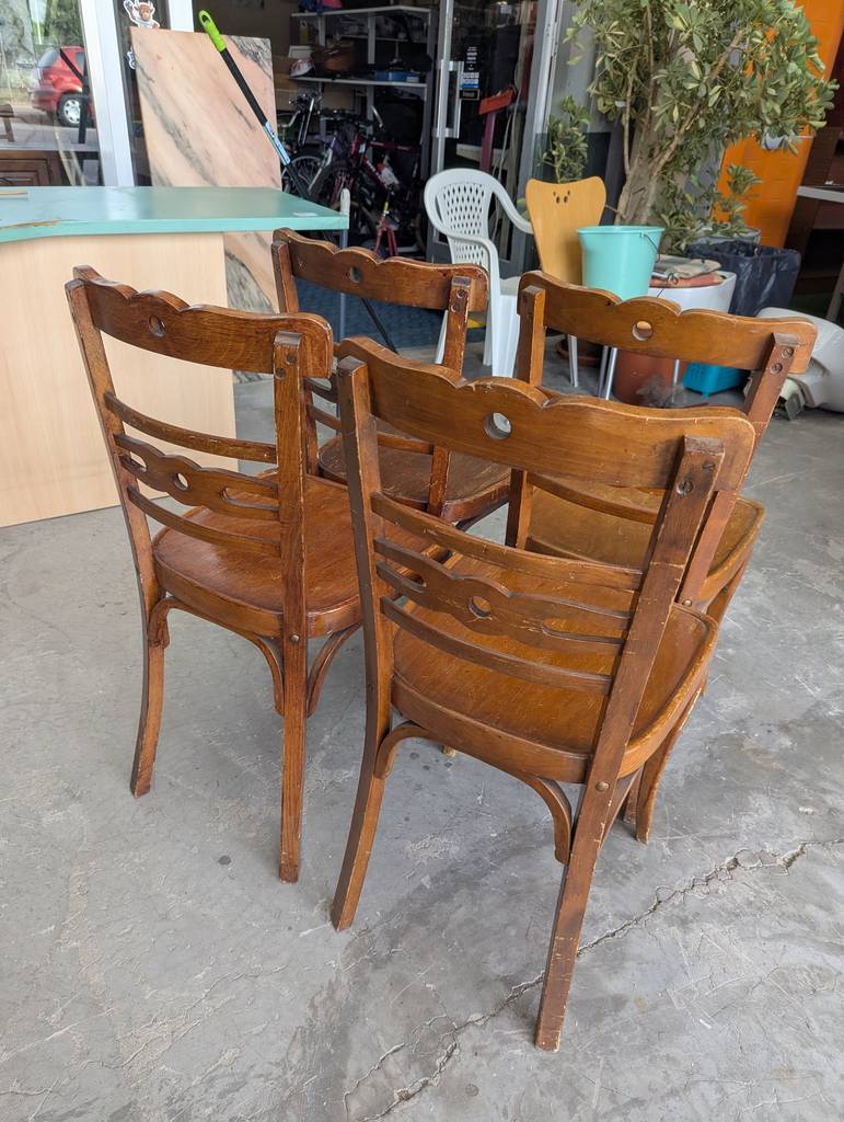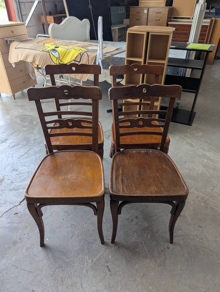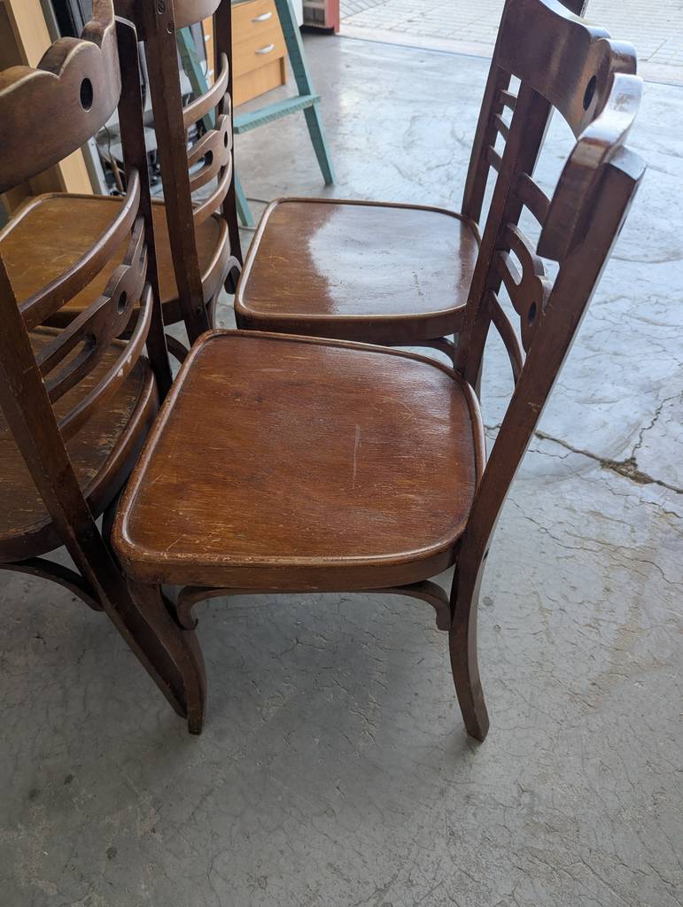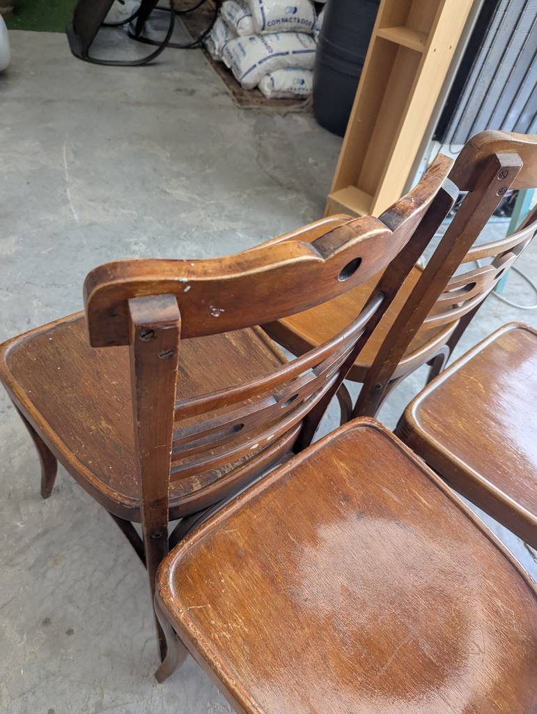Lote formado por cuatro sillas fabricadas en madera de buena calidad de color marrón oscuro. Se trata de un conjunto de cuatro sillas de madera clásicas que tienen cuatro patas robustas, un asiento cuadrangular y un respaldo formado por la unión de varios listones de madera unidos. Son cuatro sillas ideales para colocarlas en un salón comedor. Como se puede observar en las fotografías se encuentran en buenas condiciones.