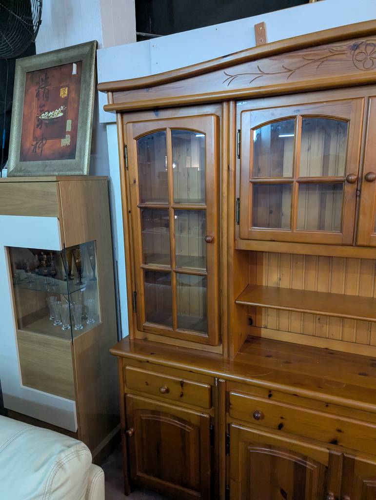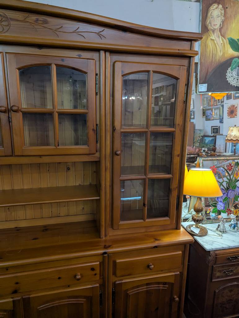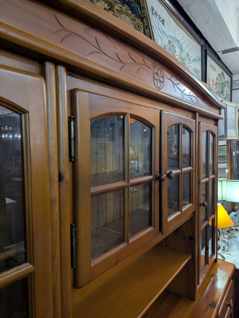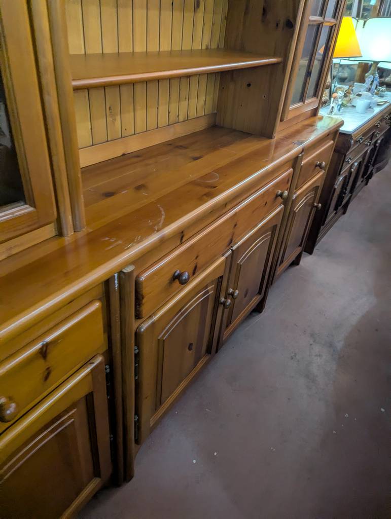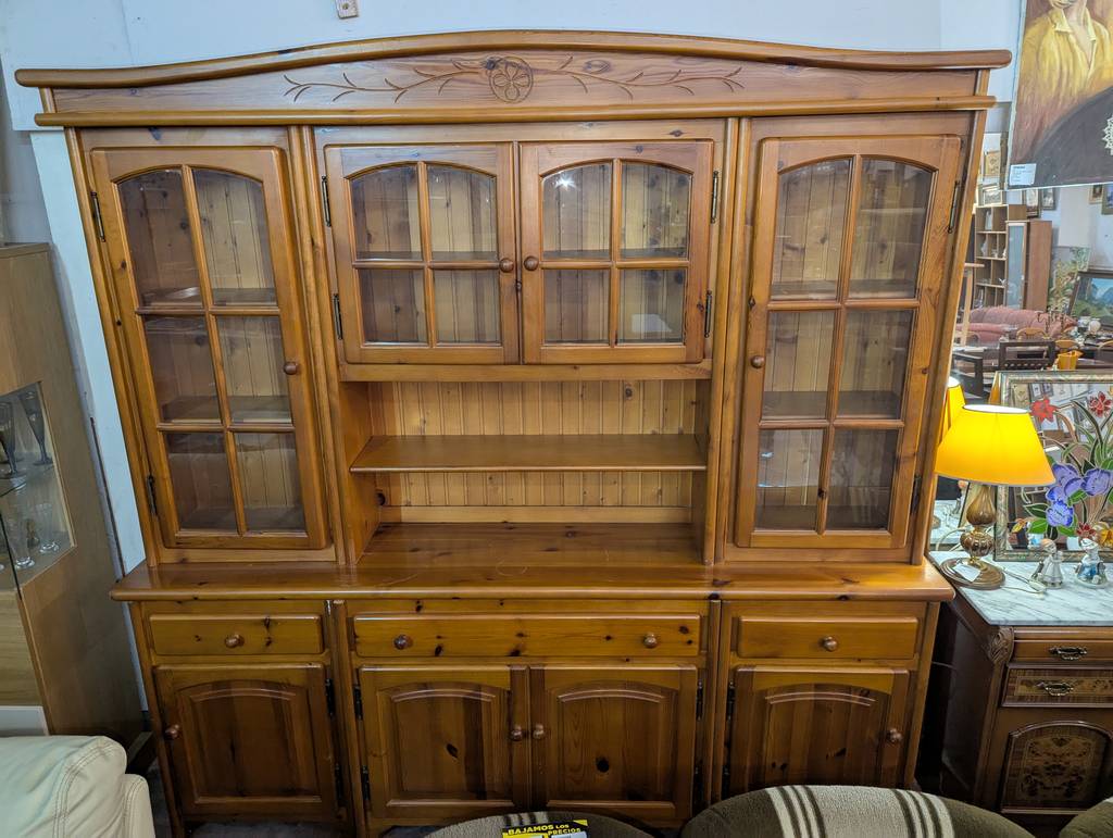 Alacena de estilo rústico de grandes dimensiones fabricada en madera de pino de buena calidad de color marrón. Se trata de una alacena grande que cuenta múltiples cajones y puertas, así como puertas a modo de vitrina y un habitáculo abierto en la parte central. Es un mueble ideal para ponerlo en un salón comedor. Como se ve en las imágenes presenta ligeros rasguños.