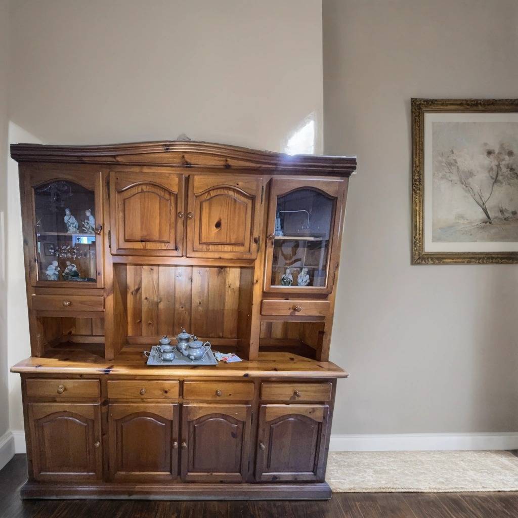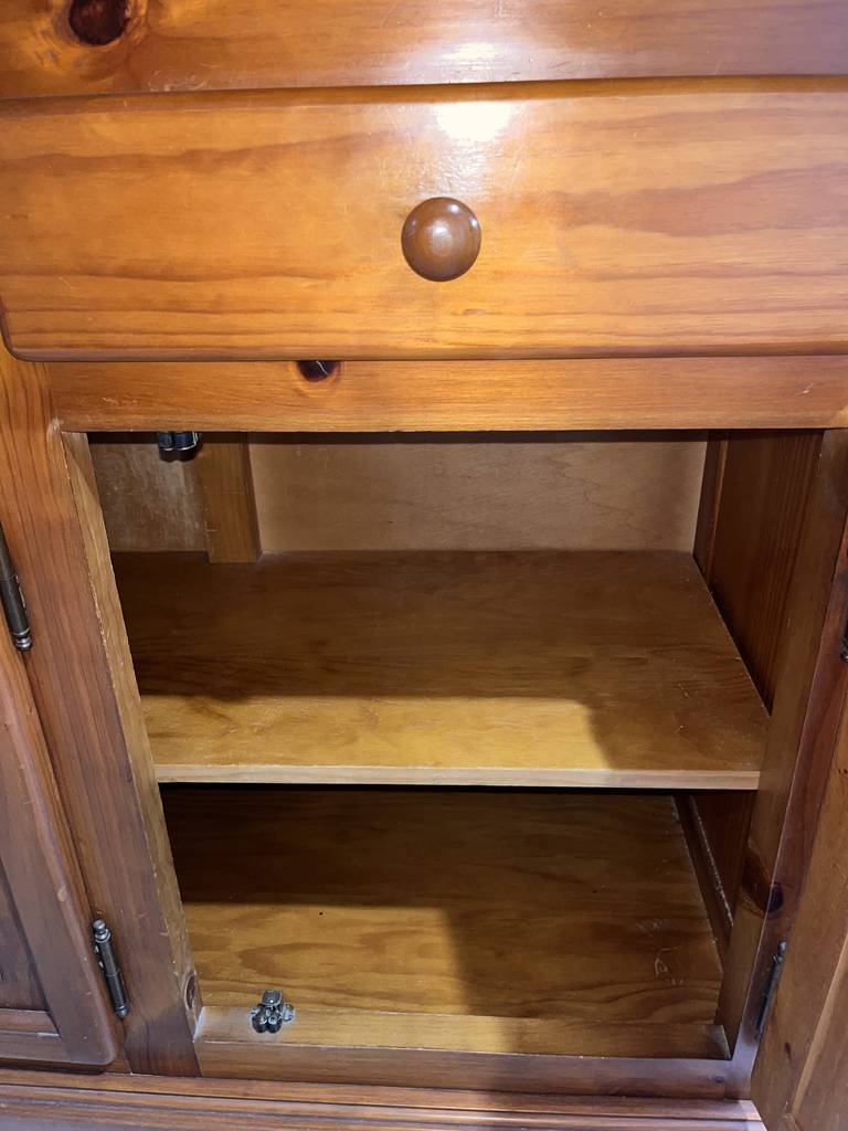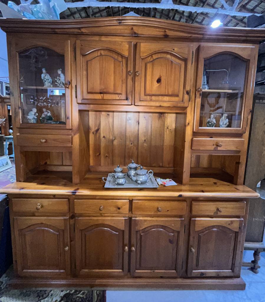 Alacena de gran tamaño de estilo rústico fabricada en madera de buena calidad en color marrón. Se trata de una alacena que cuenta con gran capacidad de almacenaje, con puertas a modo de vitrina, habitáculos abiertos así como múltiples puertas y cajones. Es una alacena ideal para colocarla en un salón comedor o en una cocina. Como se puede observar en las fotografías se encuentra en buenas condiciones