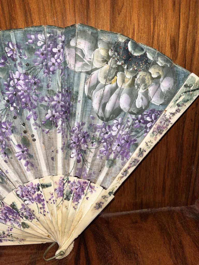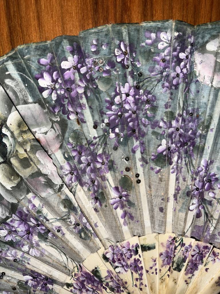 Abanico antiguo de hueso con un hermoso estampado de flores moradas y blancas. Se trata de un abanico de estilo clásico pintado a mano y fabricado con tela y hueso. Es un abanico muy especial que resulta perfecto para coleccionistas de este tipo de objetos, pero también puede servir como elemento decorativo por su belleza. Como se puede observar en las fotografías se encuentra en buenas condiciones.