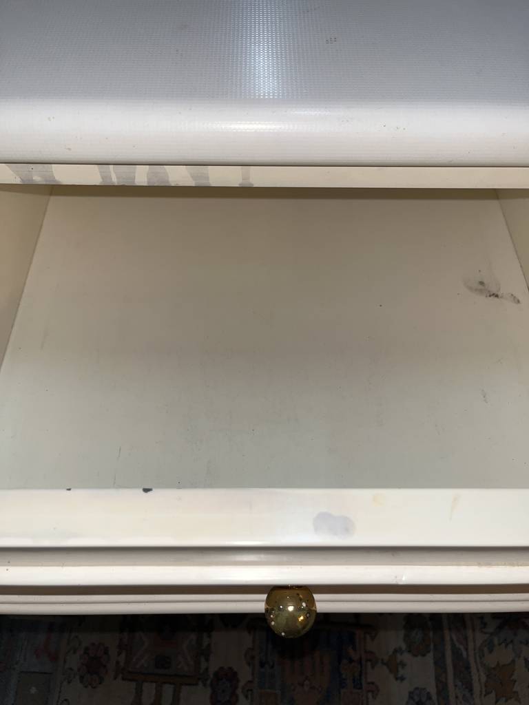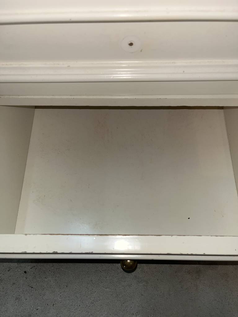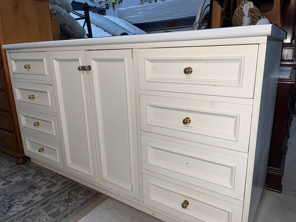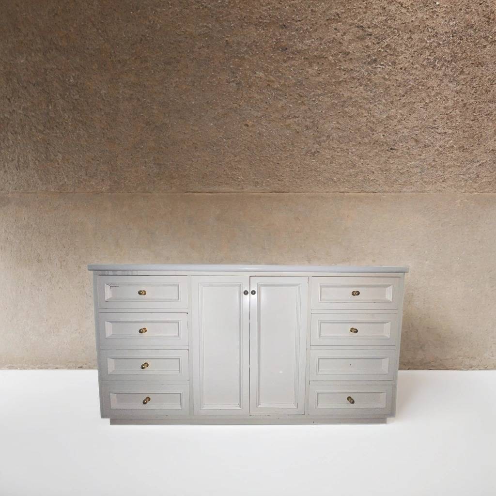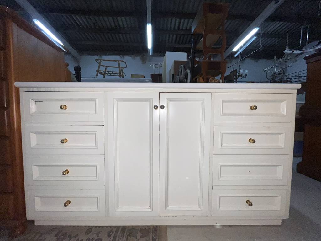 Aparador de color blanco que ha sido fabricado con madera de buena calidad y robusta. Se compone de una parte frontal con ocho cajones, cuatro en cada lateral, y en el centro dos puertas altas. Se trata de un aparador de grandes dimensiones en el que podemos almacenar gran cantidad de enseres. Es ideal para colocar en un salón comedor. Como podemos observar en las fotografías se encuentra para restaurar.