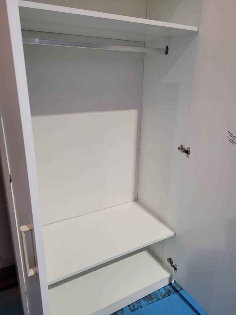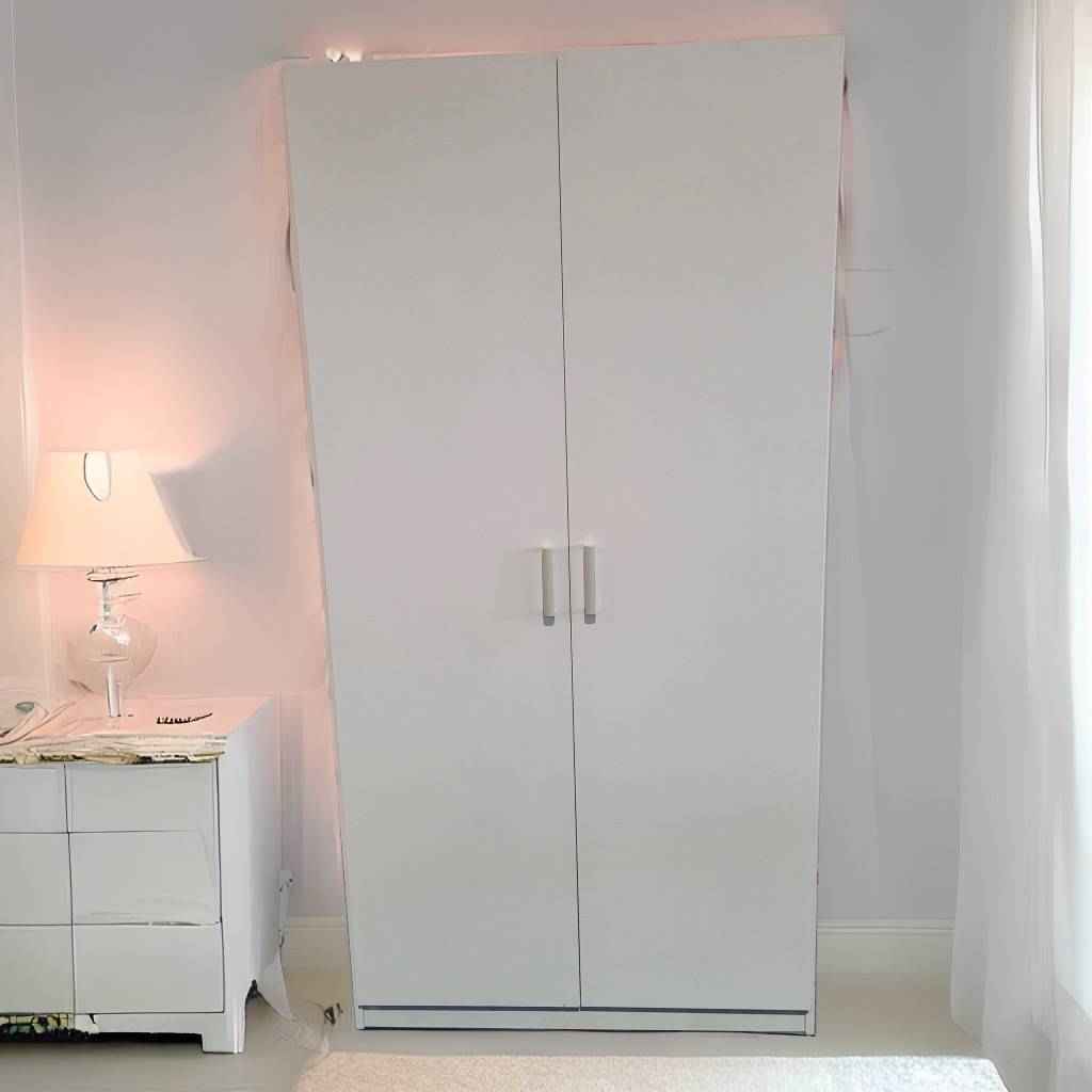 Armario nuevo a estrenar color blanco, con dos grandes puertas en la parte frontal. Las puertas tienen tiradores metálicos que facilitan su apertura. En su interior tiene una gran capacidad de almacenaje gracias a sus lejas y también a su barra para colgar ropa en perchas. Se trata de un armario moderno y minimalista, perfecto para darle un toque original al dormitorio. Es ideal tanto para colocarlo en habitaciones individuales como también en infantiles o juveniles.