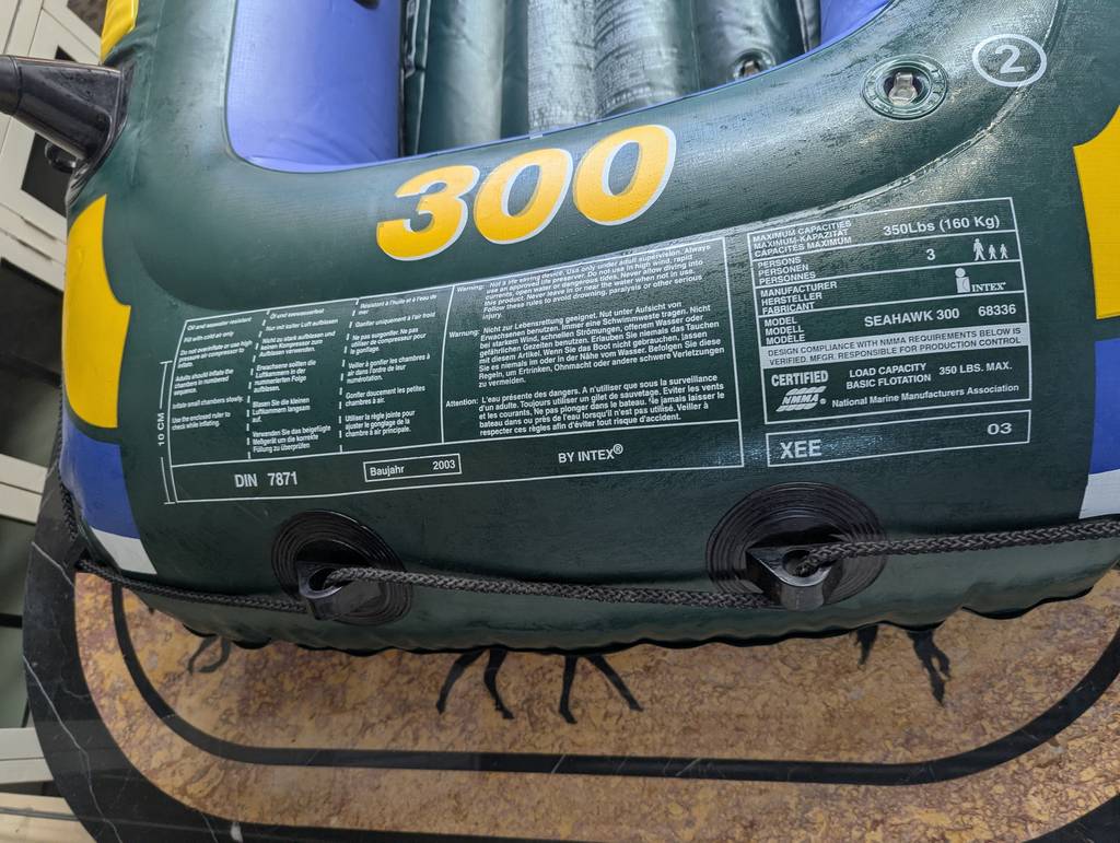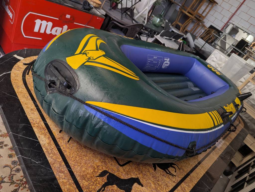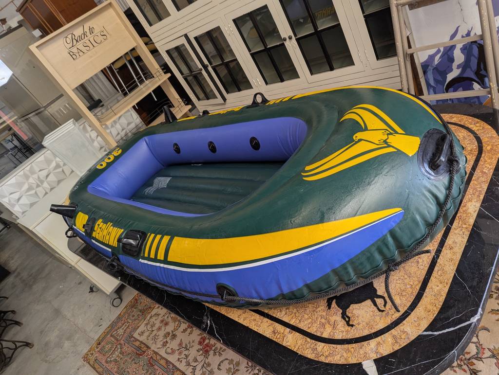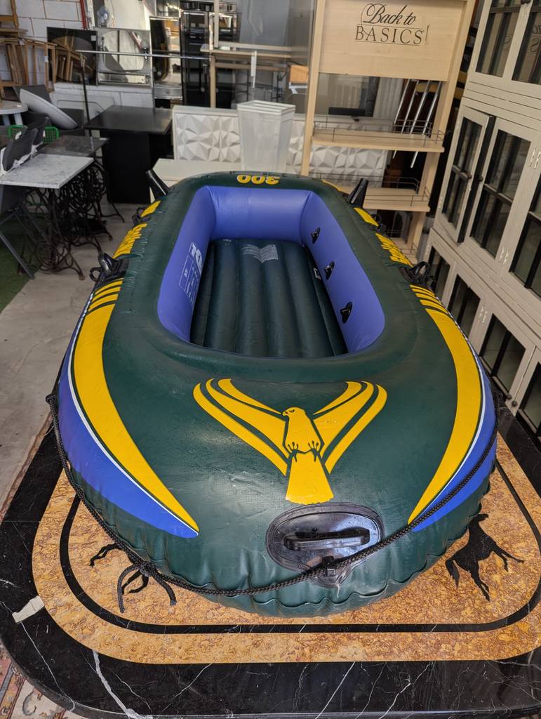 Barca hinchable modelo SEARHWAK 300 en color verde y detalles en amarillo y azul que se encuentra completa con cuerda y agarres de seguridad. Es una barca ideal para todo tipo de actividades en el mar o en rio desde para aficionados como para gente experimentada en la materia. Como podemos observar en las fotografías se encuentra en buenas condiciones.