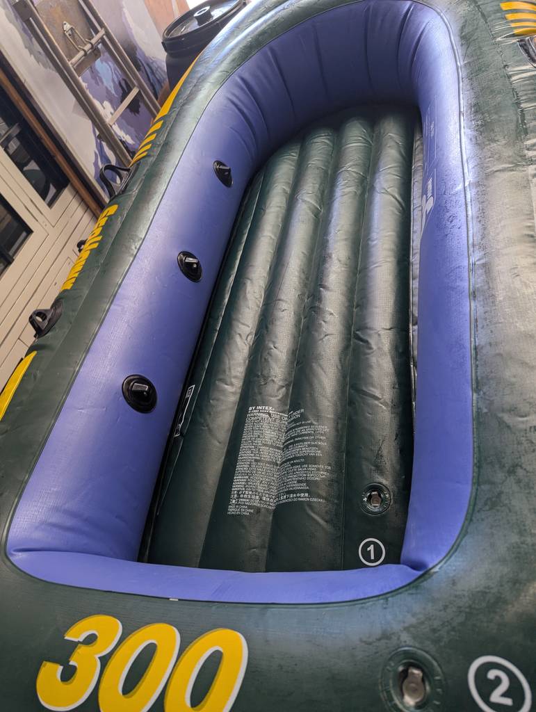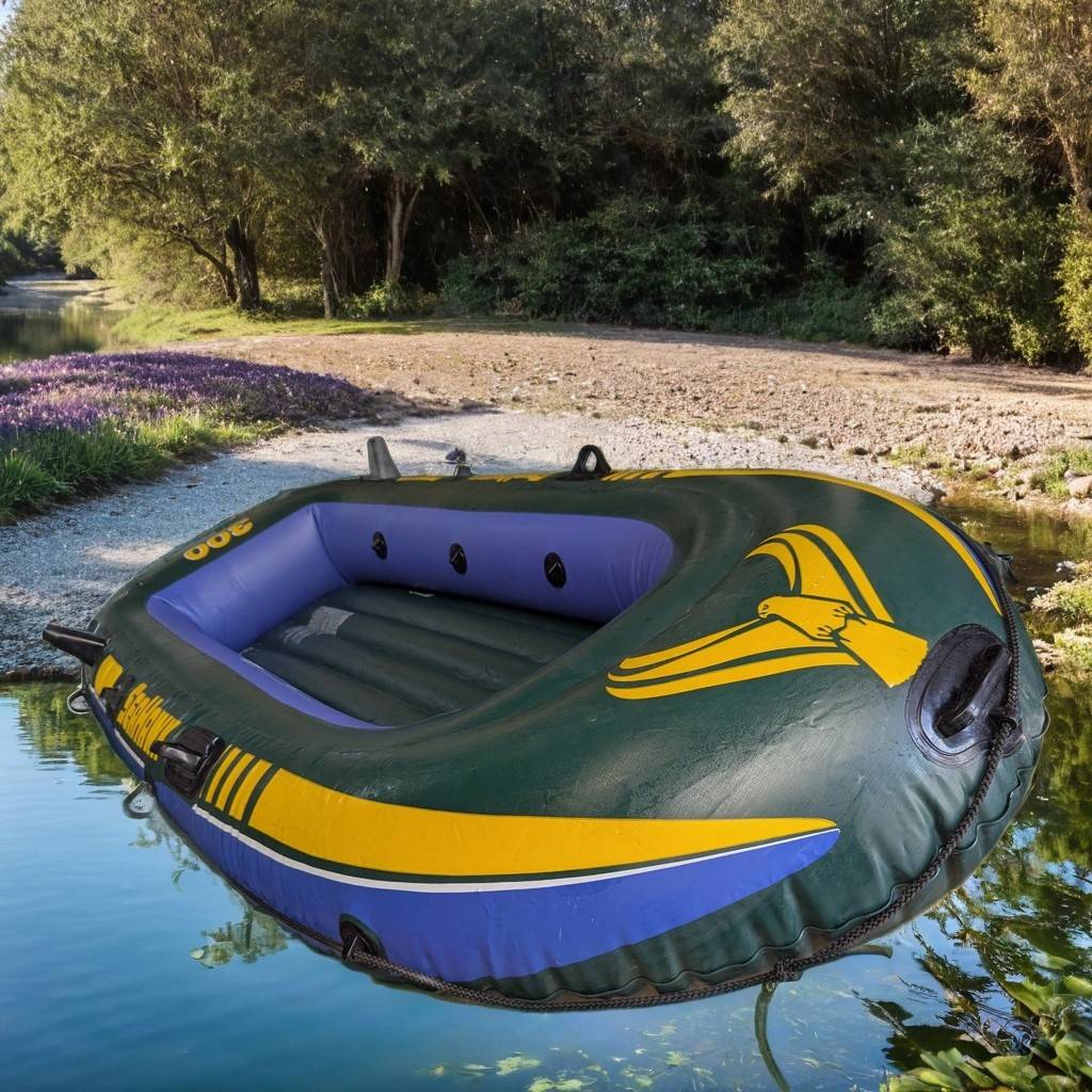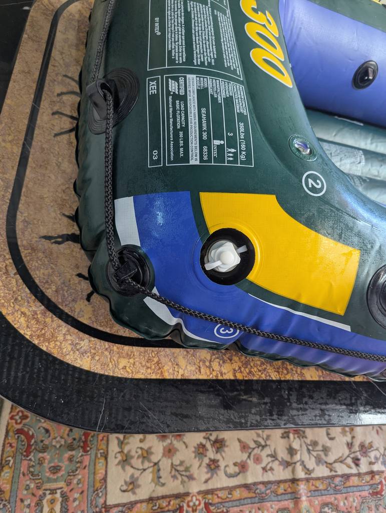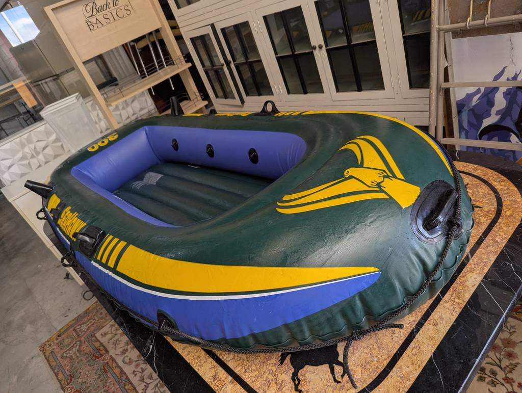 Barca hinchable modelo SEARHWAK 300 en color verde y detalles en amarillo y azul que se encuentra completa con cuerda y agarres de seguridad. Es una barca ideal para todo tipo de actividades en el mar o en rio desde para aficionados como para gente experimentada en la materia. Como podemos observar en las fotografías se encuentra en buenas condiciones.