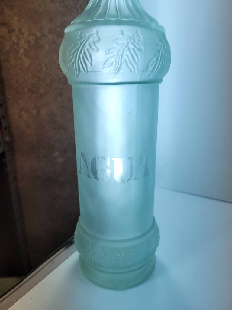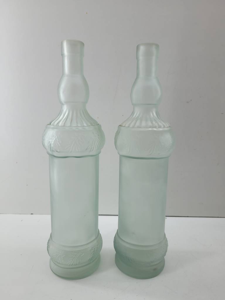 Botellas antiguas de agua o vino fabricadas en cristal grueso de buena calidad y transparente. Se trata de una pareja de botellas que no disponen de tapón y resultan ideales para guardar dentro cualquier tipo de líquido ya sea agua o una bebida alcohólica. Son dos botellas que se pueden utilizar como elementos decorativos en un hogar de estilo clásico. Como se puede observar en las fotografías se encuentran en buenas condiciones.