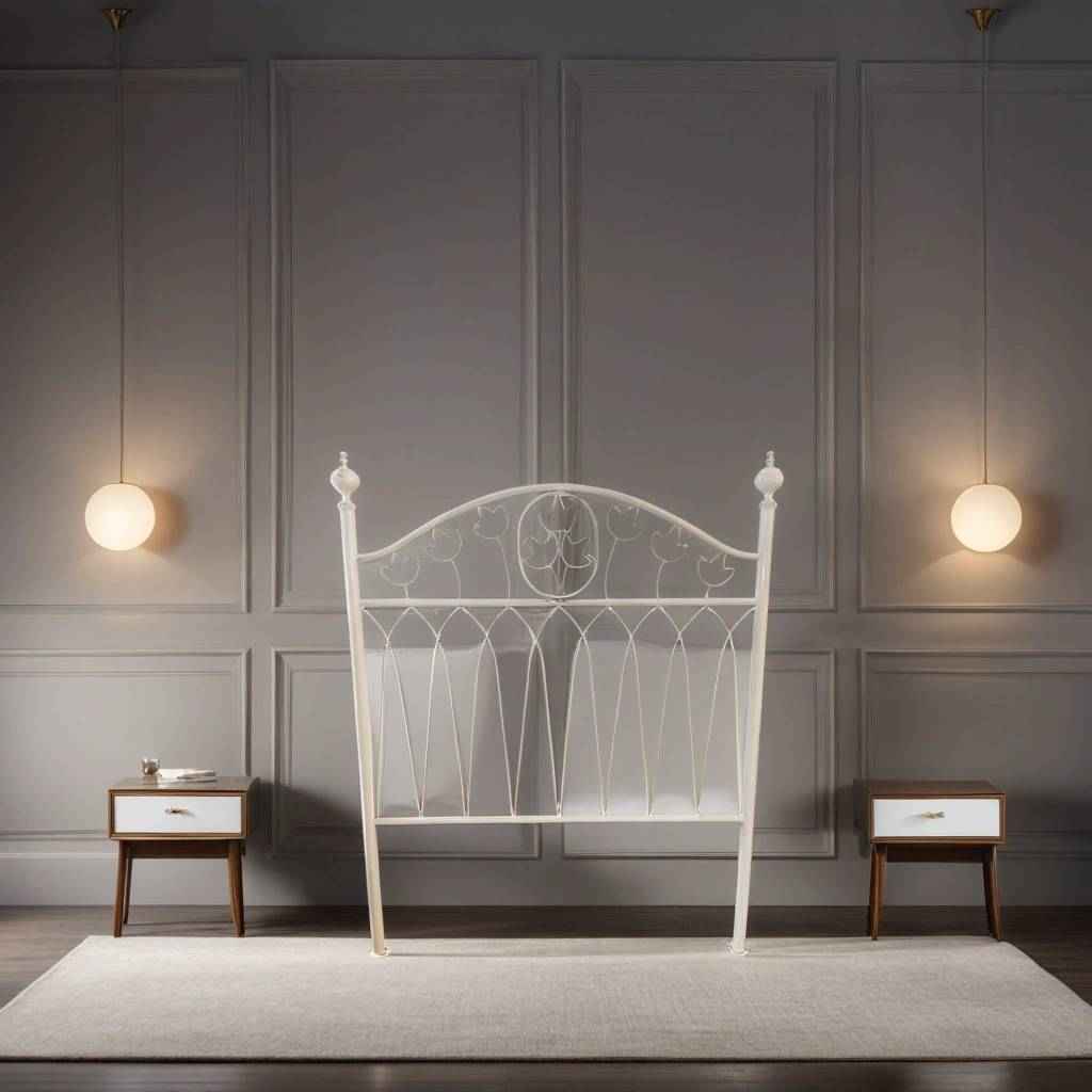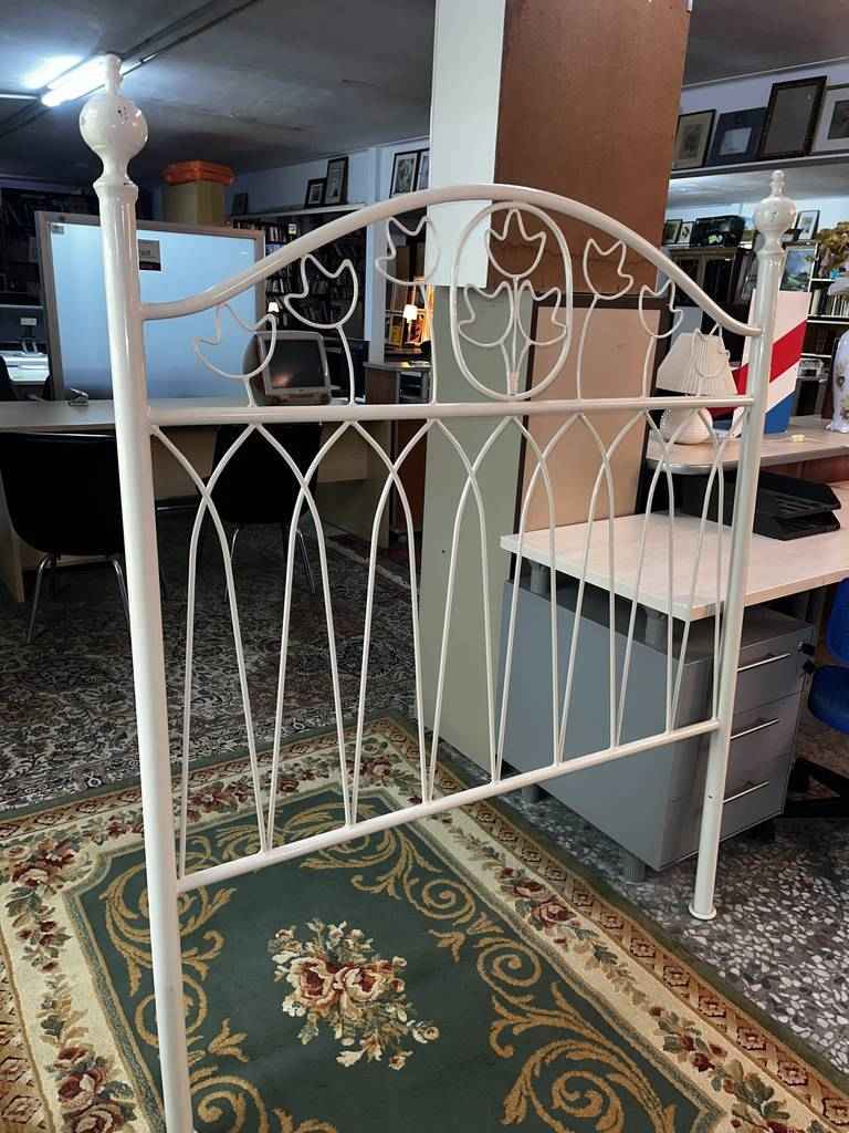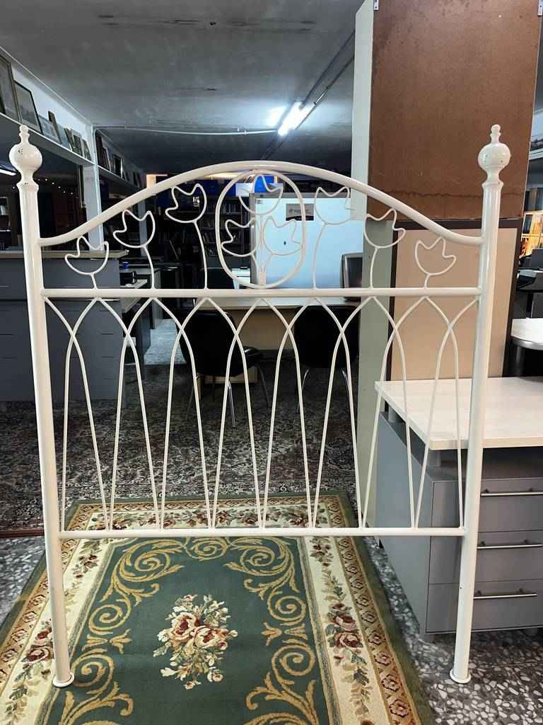 Cabezal de color blanco para una cama individual de 110 cm. Fabricado en hierro de buena calidad. Tiene unos dibujos y formas muy bonitas y originales. En la parte superior contiene unos dibujos de tulipanes. Es un cabecero ideal para un dormitorio individual. Uno de los laterales presenta algunos rasguños.