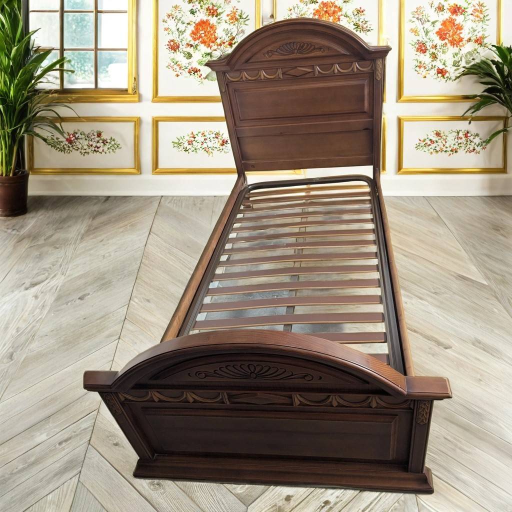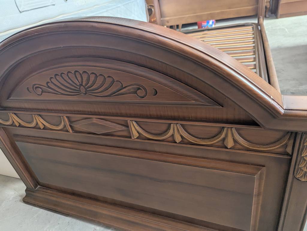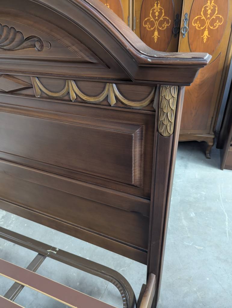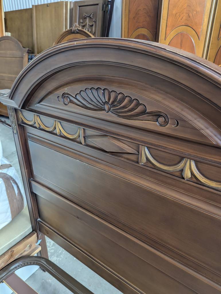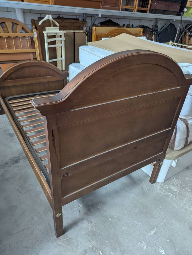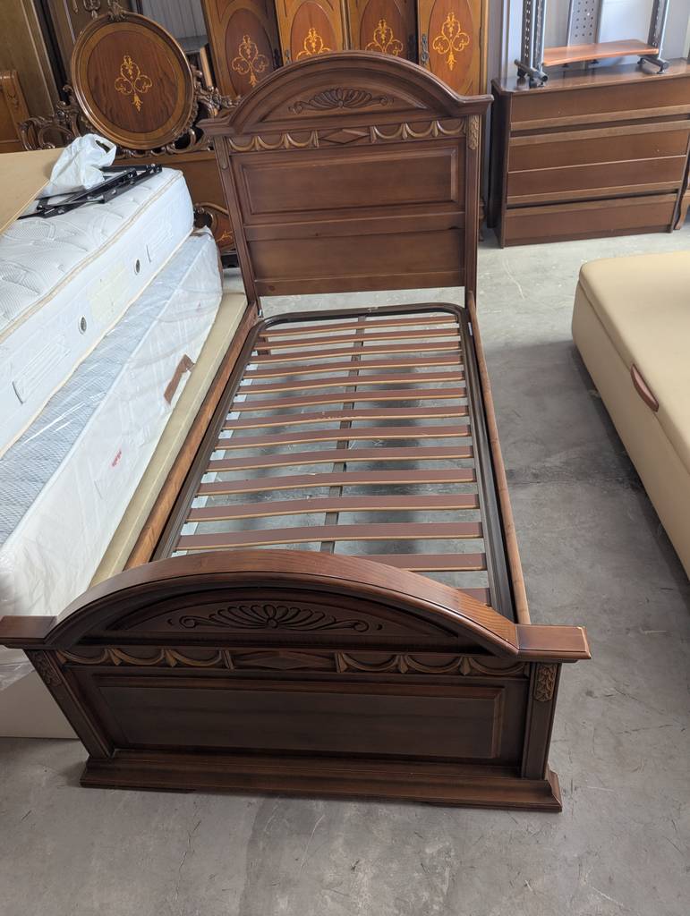 Estructura de cama de estilo clásico que ha sido fabricada con madera de buena calidad y robusta. Se trata de una estructura muy elegante y con un somier preparado para un colchón de 90x190cm. Su cabecero y pie son en forma de arco grande. Es ideal para colocar en un dormitorio individual. Como podemos observar en las fotografías se encuentra en buenas condiciones.