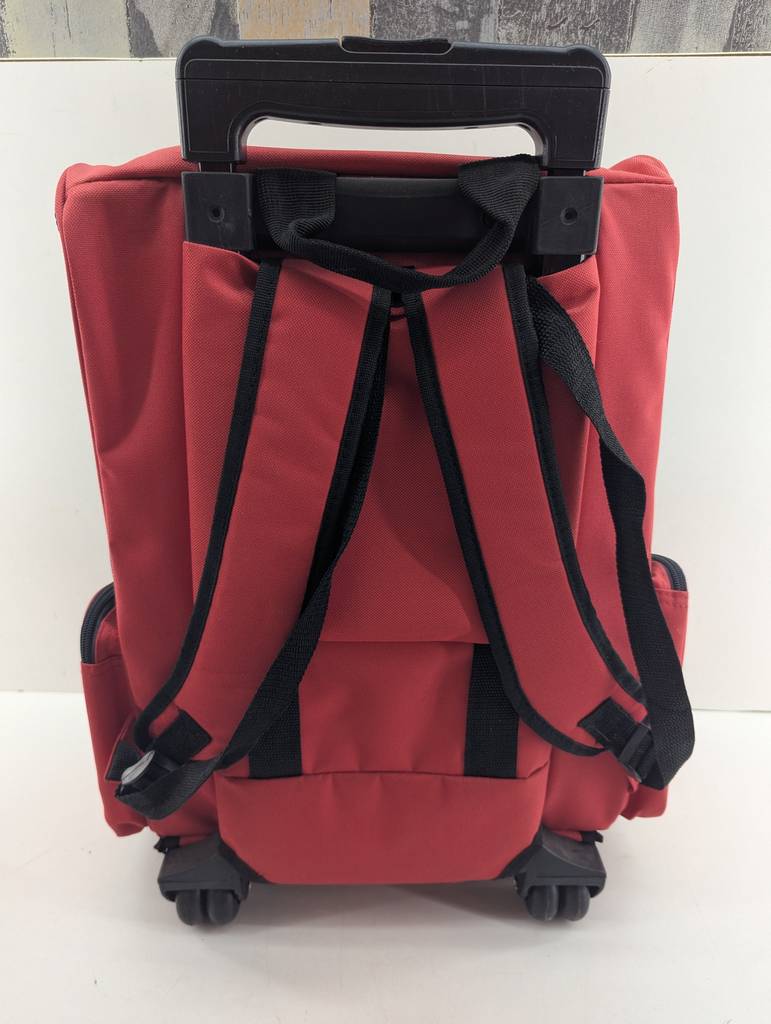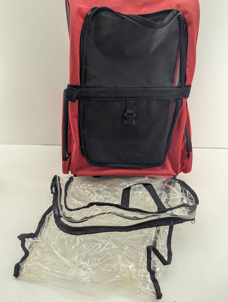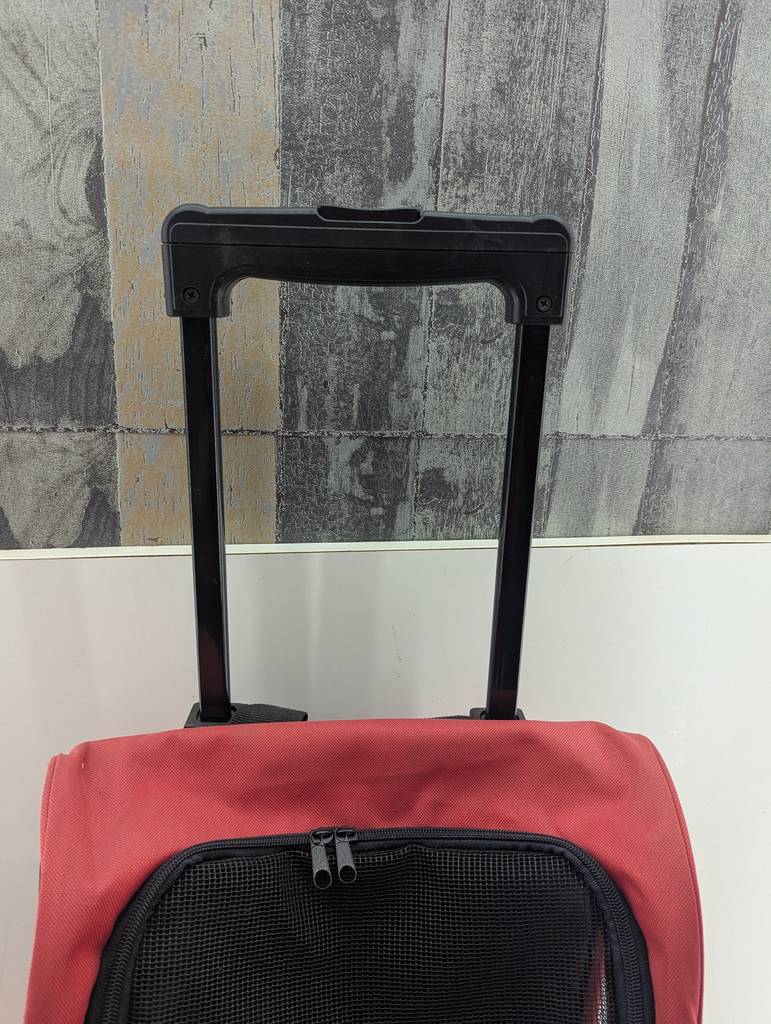 Carrito para mascotas de color rojo y negro. Se trata de un carrito para mascotas que cuenta con dos ruedas y un asa en la parte superior para poder llevarlo arrastrando como si fuera una maleta. El carrito también dispone de dos asas traseras para poder llevarlo colgado a la espalda como una mochila. Es un carrito ideal si tienes una mascota de tamaño pequeño o mediano. Como se puede observar en las fotografías se encuentra en buenas condiciones.
