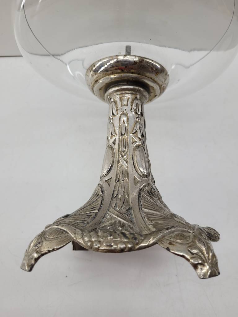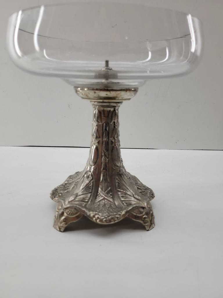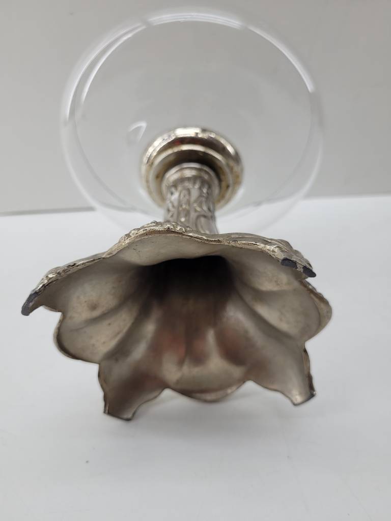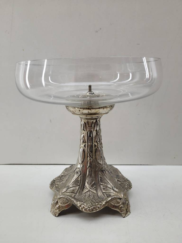 Centro de mesa de estilo clásico formado por una base fabricada en metal y una superficie en forma de copa de cristal grueso. Se trata de un centro de mesa que tiene la forma de una copa de sidra y es ideal para colocarlo en un salón comedor de estilo vintage. Como se puede observar en las fotografías el centro de mesa tiene algunas manchas por el uso.
