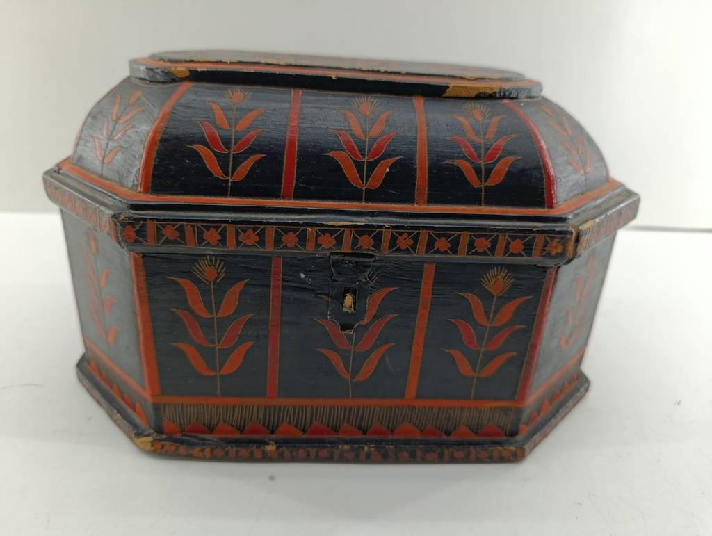 Cofre hexagonal de mandera tallada de color marrón oscuro con detalles de color naranja. Se trata de un cofre hexagonal de tamaño mediano que tiene una tapa y cuenta con un espacio interior para guardar pequeños objetos. Es un cofre perfecto para usarlo como elemento decorativo. Como se puede observar en las fotografías el cofre presenta ligeros desperfectos que no afectan a su funcionalidad.