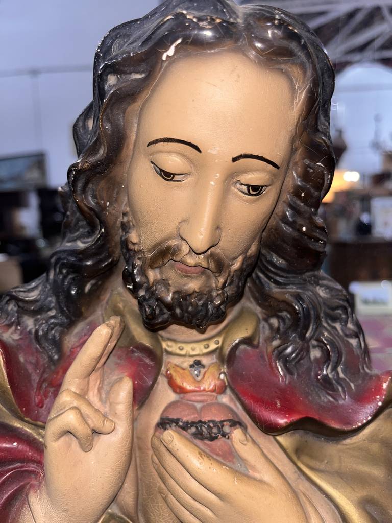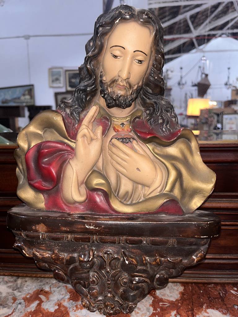 Figura de Cristo Sagrado Corazón fabricada en escayola de buena calidad y resistente de color marrón oscuro, dorado y rojo. Se trata de una figura clásica de nuestro señor Jesucristo que aparece sosteniendo un pequeño corazón. La figura es ideal para colgarla de la pared de un dormitorio o de un salón comedor ya que tiene un enganche en la parte trasera. Como se puede observar en las fotografías se encuentra en buen estado.