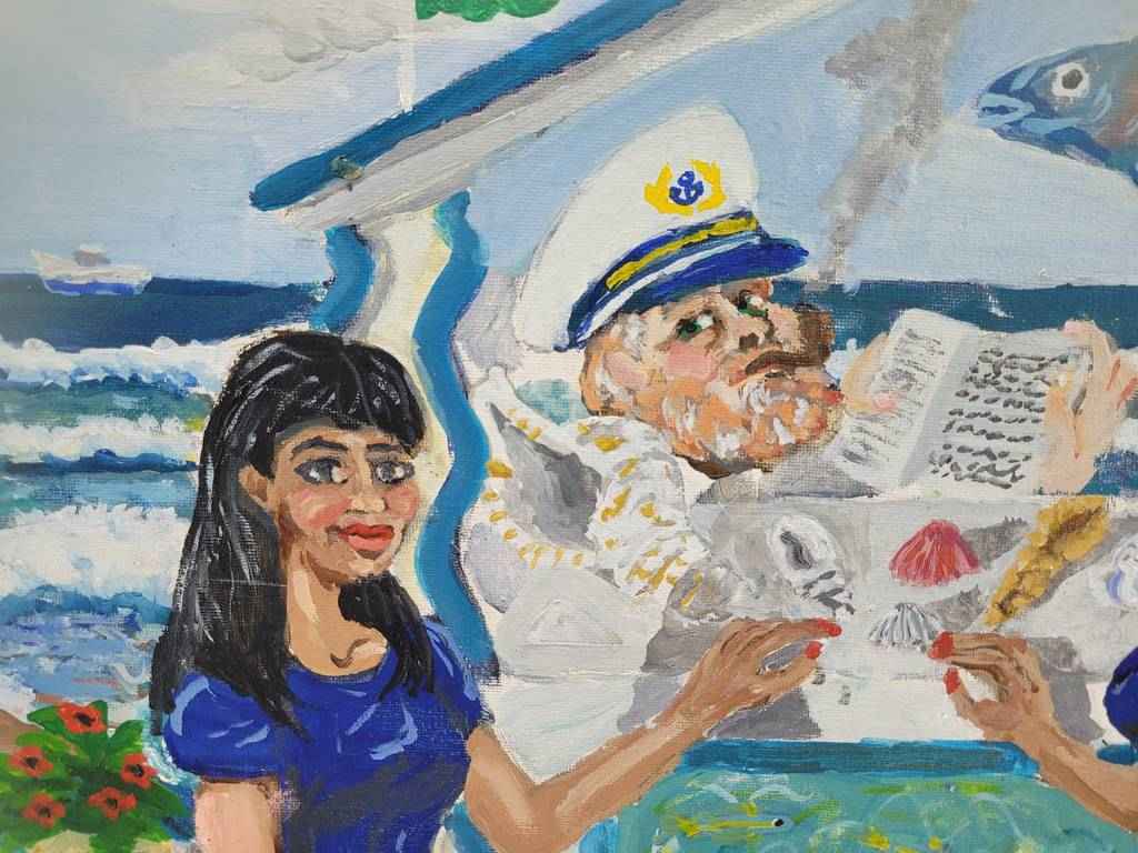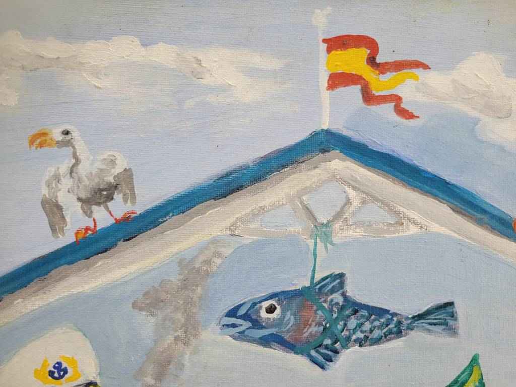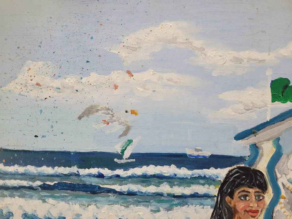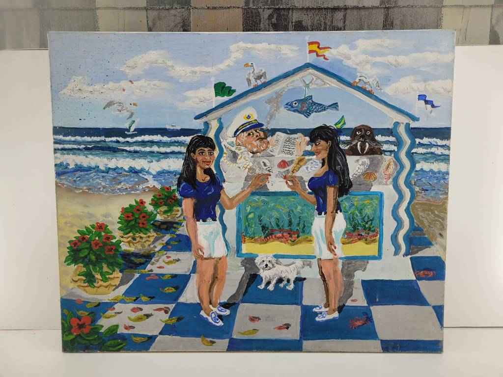 Cuadro pintado al óleo de estilo naíf de la artista Marí. Se trata de un cuadro pintado al óleo sobre lienzo que no dispone de marco y representa un pequeño chiringuito en la playa al que dos jóvenes vestidas igual van a comprar algo. Es un cuadro muy vistoso y alegre que hará destacar la estancia en la que lo coloques. Como se ve en las imágenes está en buen estado.