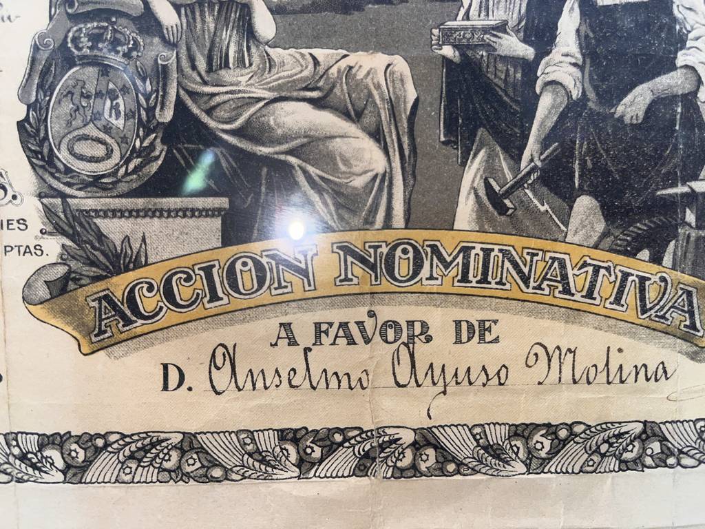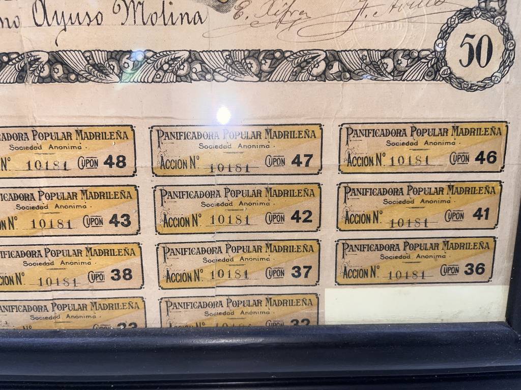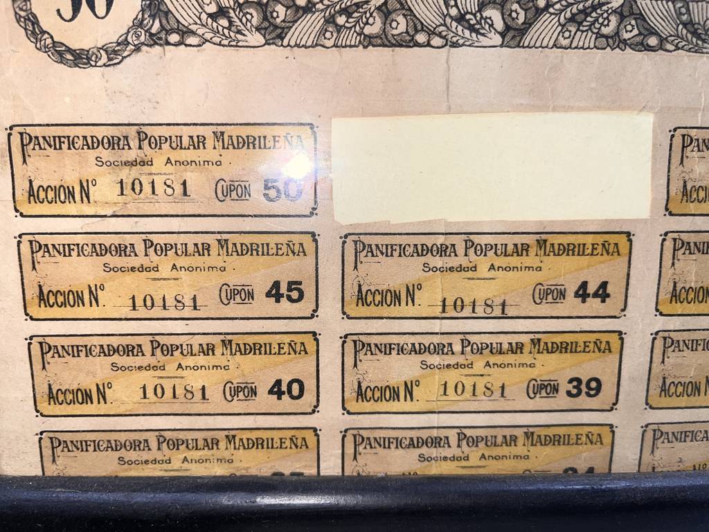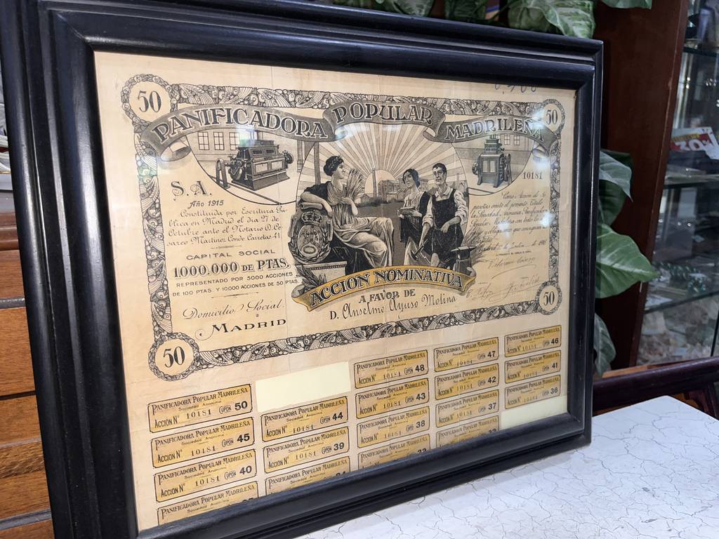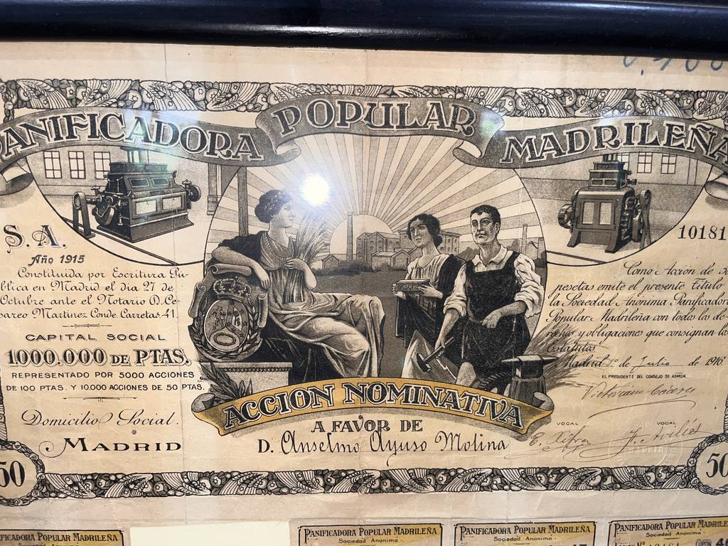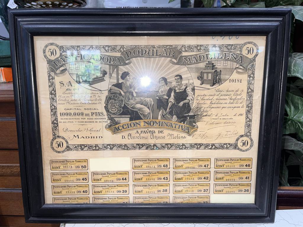 Cuadro enmarcado con un elegante marco de madera de buena calidad de color negro en el que aparecen unas acciones nominativas de la panificadora popular de Madrid pertenecientes al año 1915. Se trata de un cuadro con acciones por valor de un millón de pesetas a favor de Anselmo Ayuso Molina. Es un cuadro ideal para coleccionistas. Como se ve en las imágenes está en buen estado de conservación.