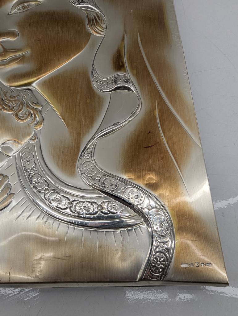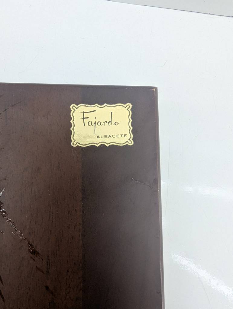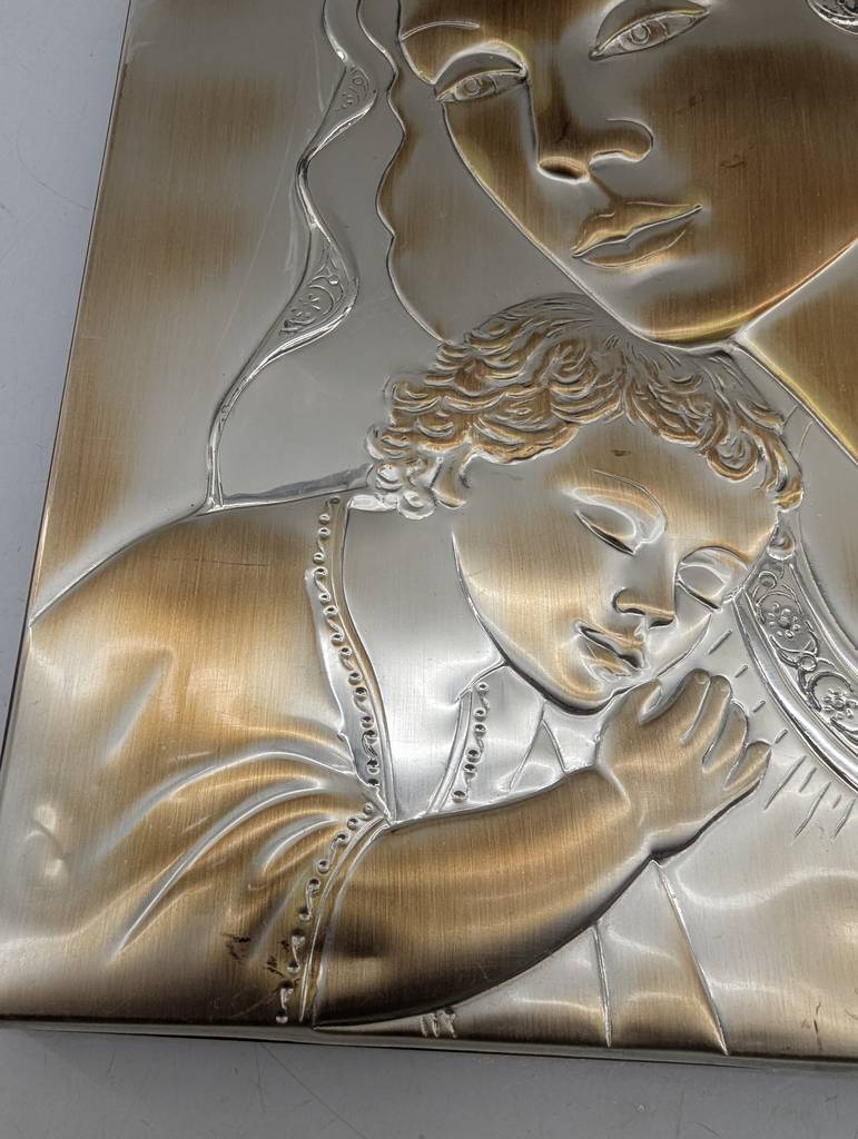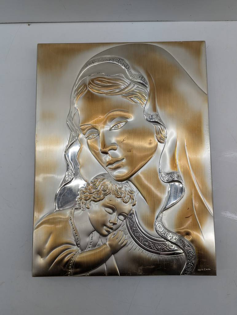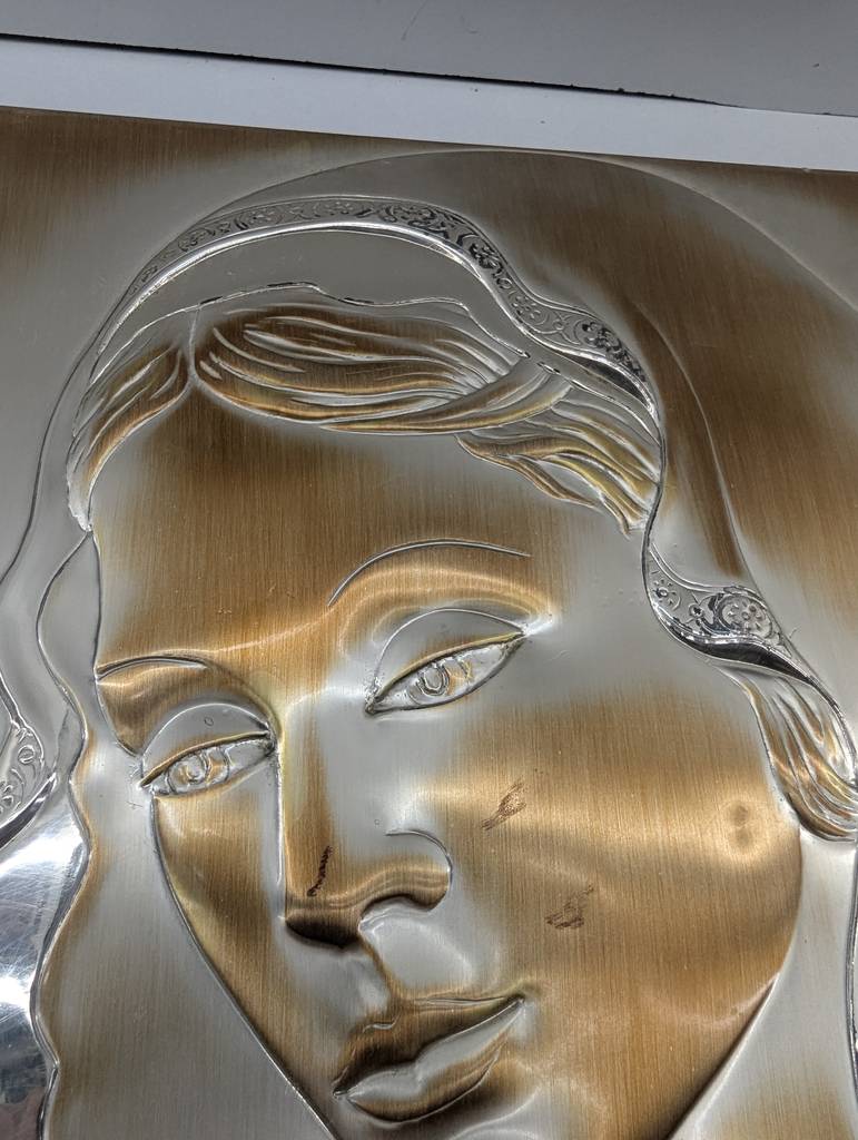 Cuadro de la virgen con el niño en brazos del artista Fajardo realizado en Albacete. Se trata de un hermoso cuadro grabado en relieve que muestra la cara de la virgen que aparece sosteniendo entre sus brazos al pequeño niño Jesús. Es un cuadro muy bonito y llamativo ideal para colocar en el salón comedor. Como se puede observar en las fotografías se encuentra en buenas condiciones.