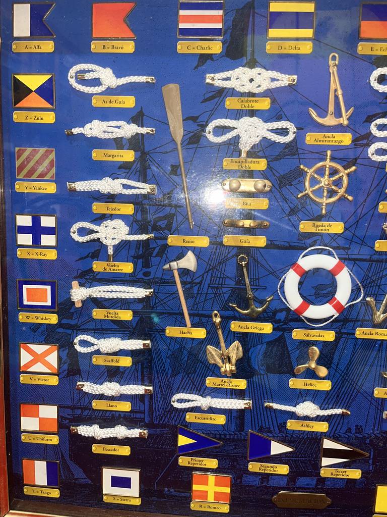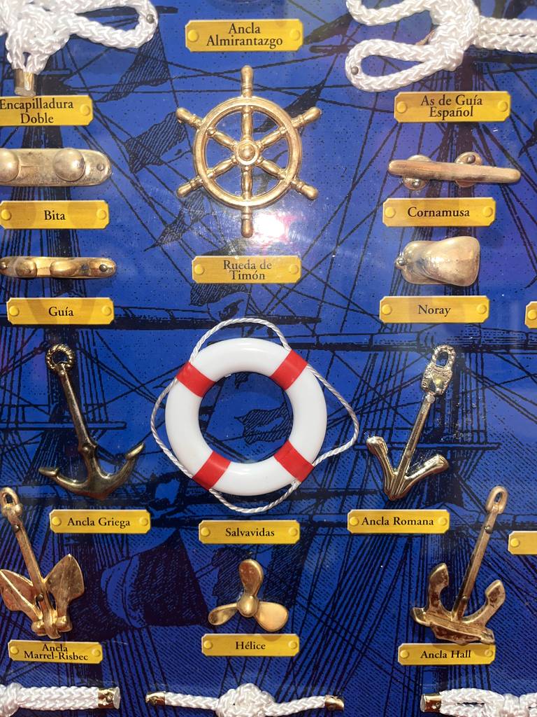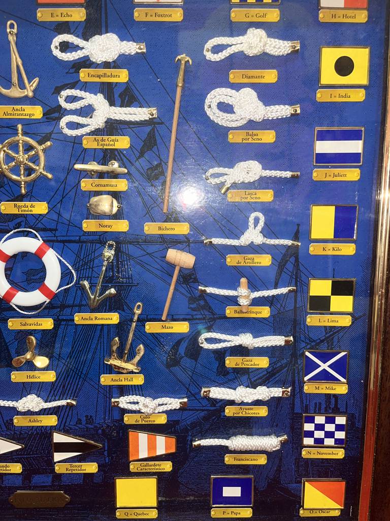 Cuadro de nudos marineros con una forma cuadrada con un marco de madera de buena calidad de color marrón oscuro. Se trata de un cuadro cuadrado con distintos nudos marineros con los nombres que tiene cada uno. Es un cuadro perfecto para amantes del tema naval. Como se puede observar en las fotografías se encuentra en buenas condiciones.