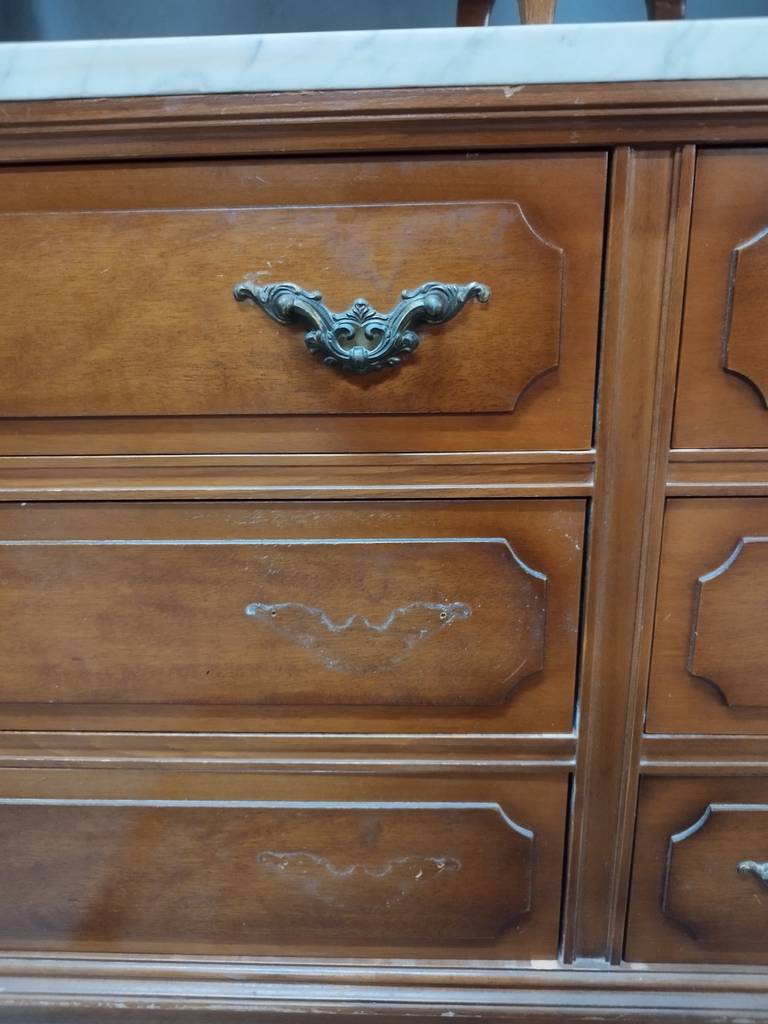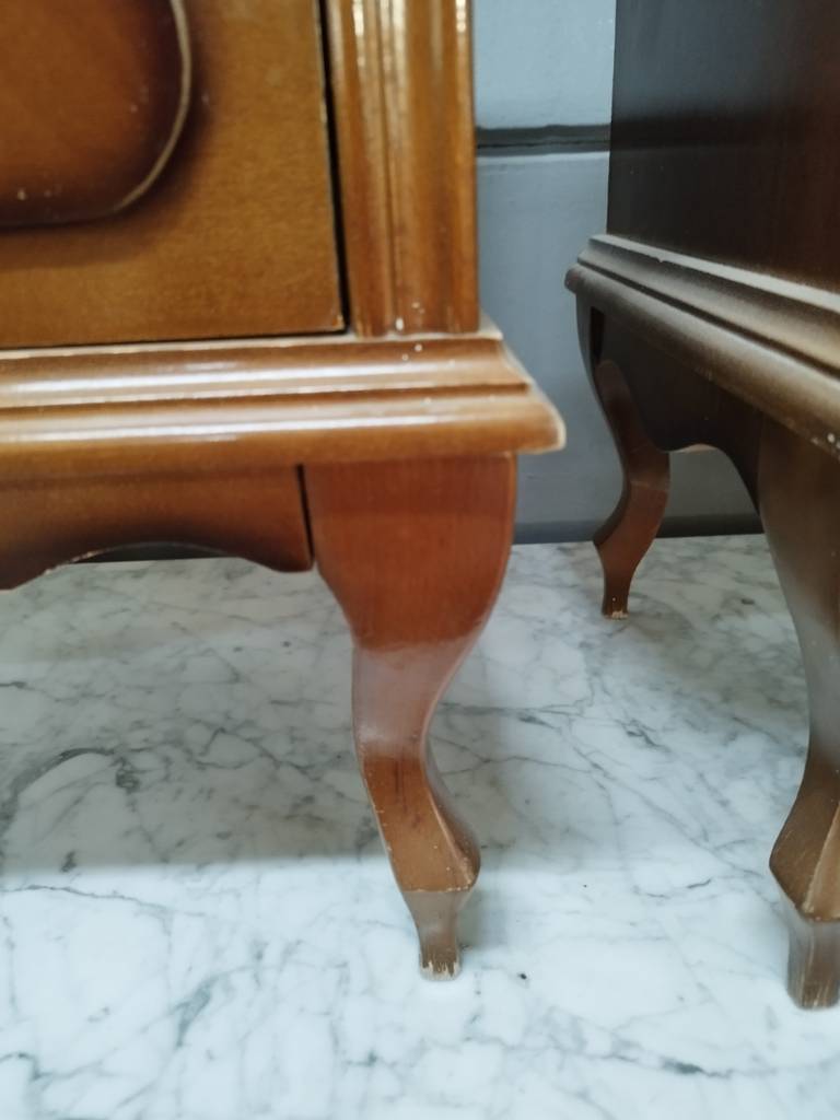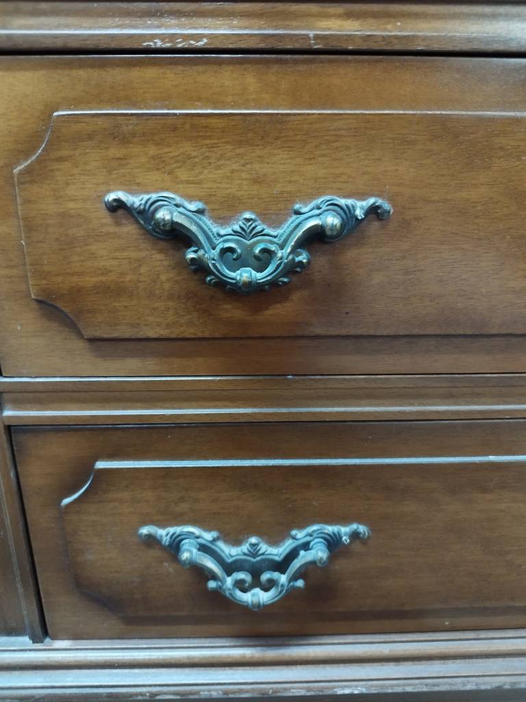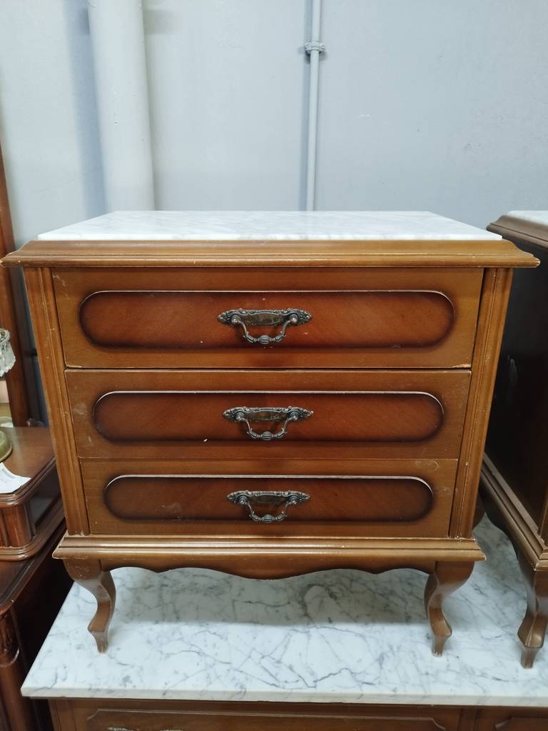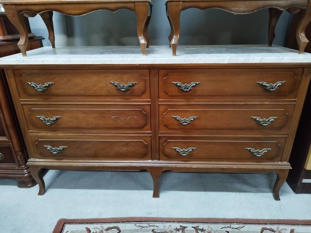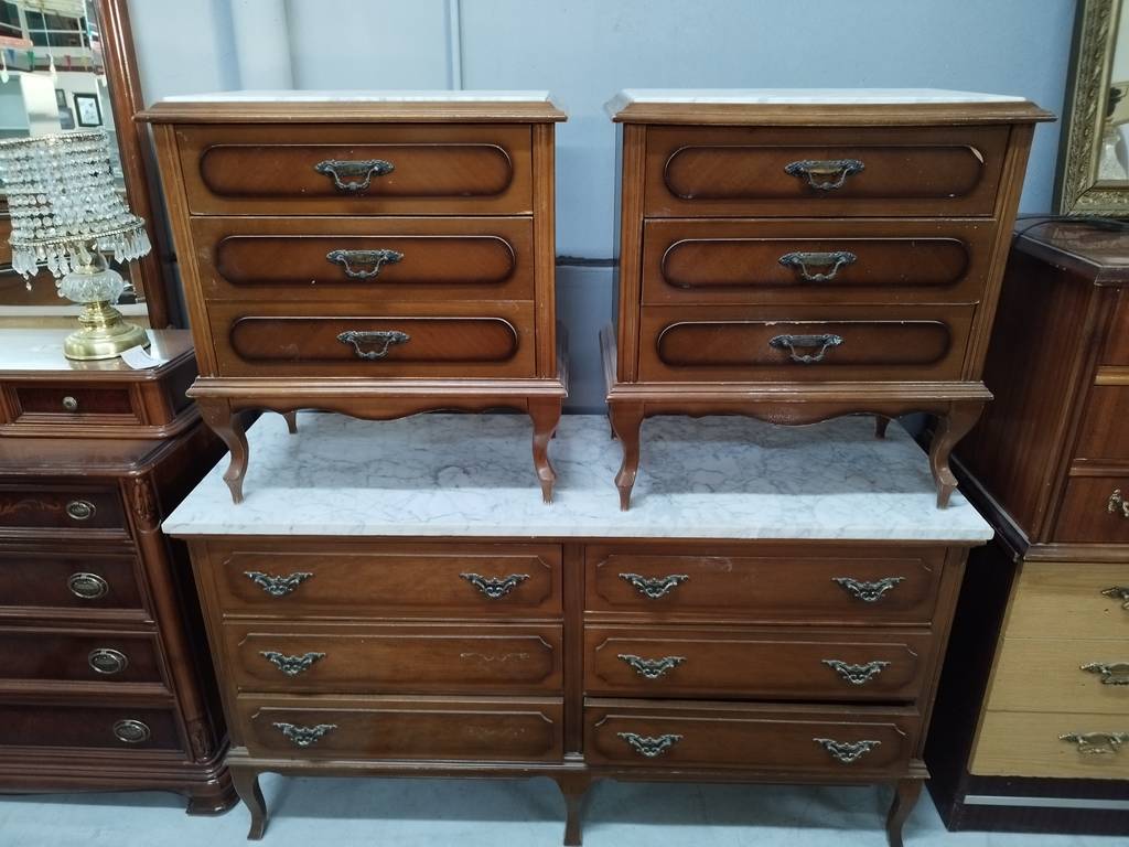 Conjunto formado por una cómoda y dos mesitas fabricadas en madera de buena calidad de color marrón oscuro. Se trata de una cómoda amplia que cuenta con seis cajones con tiradores metálicos que va acompañada de dos mesitas de noche con tres cajones cada una y una superficie blanca de efecto mármol. Es un conjunto ideal para amueblar un dormitorio. Como se ve en las imágenes la cómoda presenta ligeros desperfectos.
