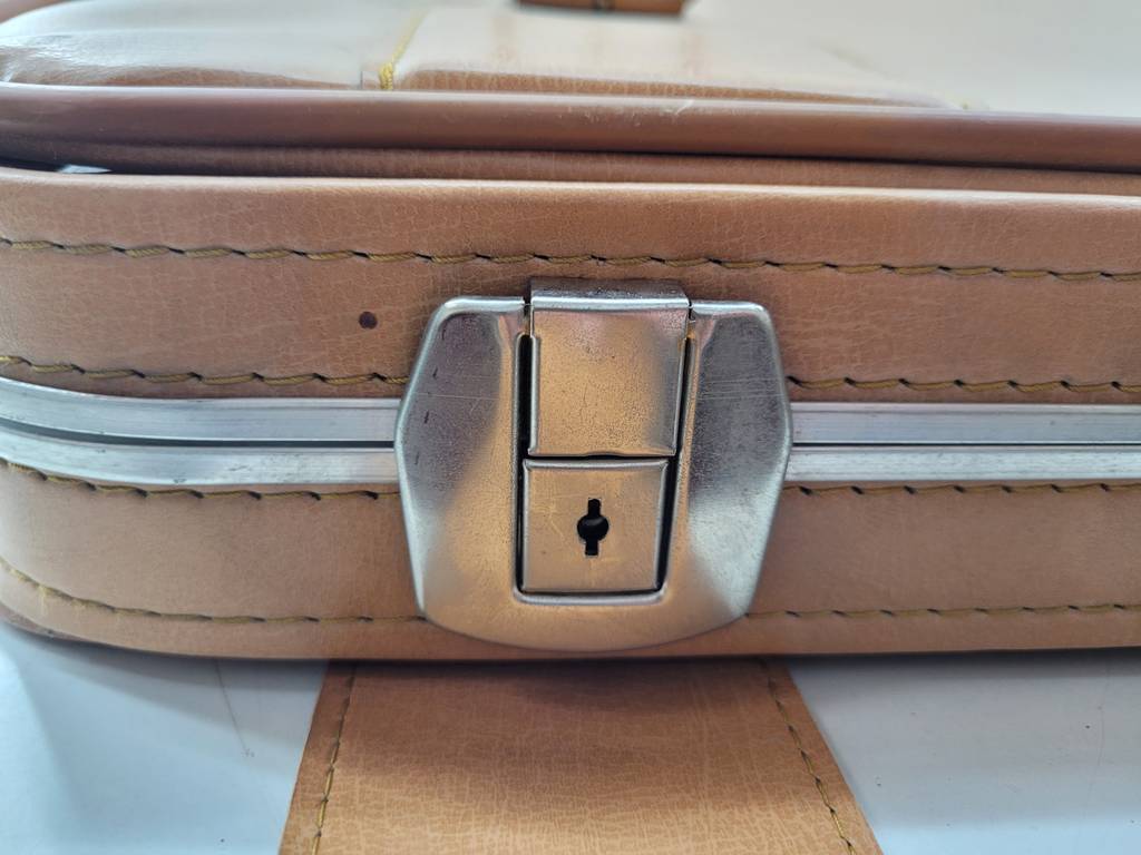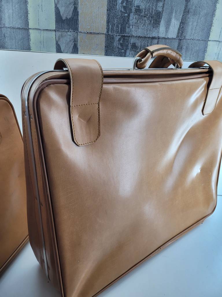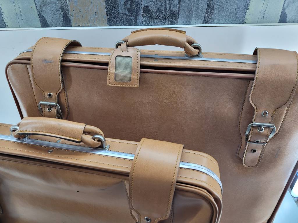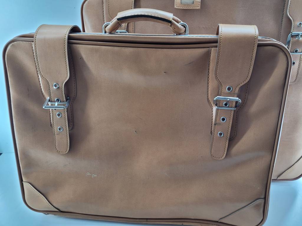 Juego de dos maletas de cuero. Se trata de dos maletas de estilo vintage, una es de tamaño medio y otra grande. Son ideales para ser utilizadas para viajes de negocios o para transportar documentación diariamente. Disponen de cierre de seguridad doble a modo de cinturón con hebilla y también incorporan un asa para transportarlas fácilmente. Como podemos observar en las fotografías presentan ligeros desperfectos.