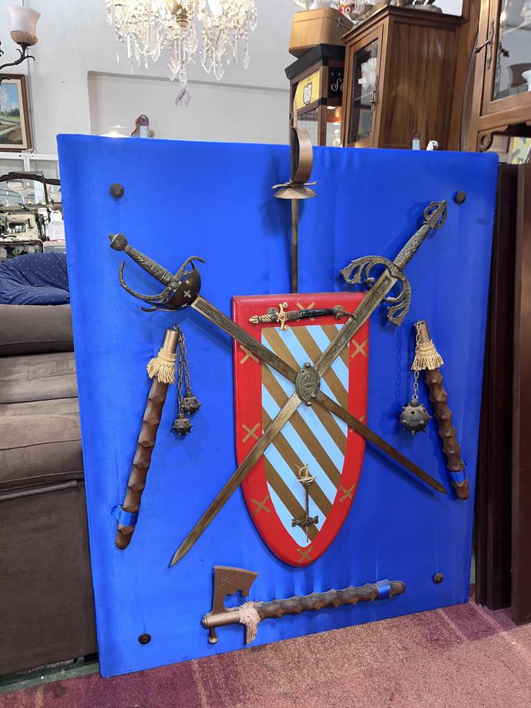 Escudo de armas de gran tamaño. Se trata de un escudo de armas que tiene una forma rectangular y cuenta con un fondo azul oscuro y varias espadas entrelazadas encima de un escudo. Tiene otras armas alrededor del escudo que contribuye a hacer de este cuadro un objeto muy llamativo. Como se puede ver en las imágenes está en buenas condiciones.
