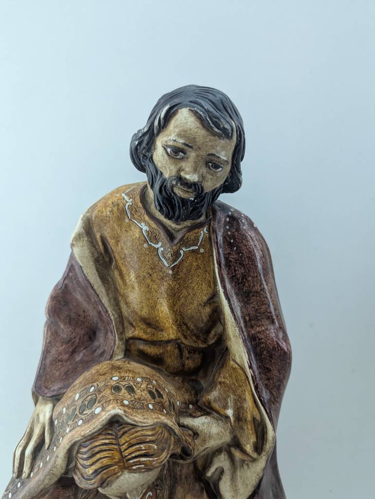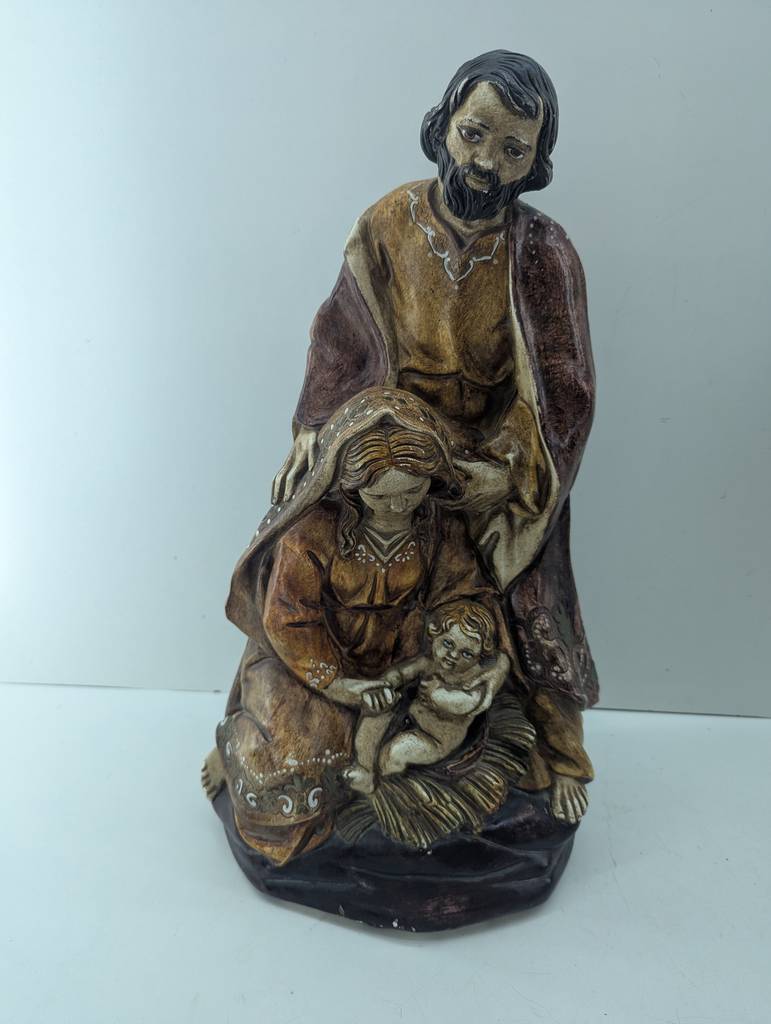 Escultura de nacimiento de tamaño mediano de colores oscuros. Se trata de una figura de un nacimiento en el que aparecen el señor José, la virgen María y el pequeño niño Jesús. Es una escultura muy bonita que resulta ideal para tenerla en un salón comedor en época navideña o para coleccionistas de objetos religiosos. Como se puede observar en las fotografías se encuentra en buenas condiciones.