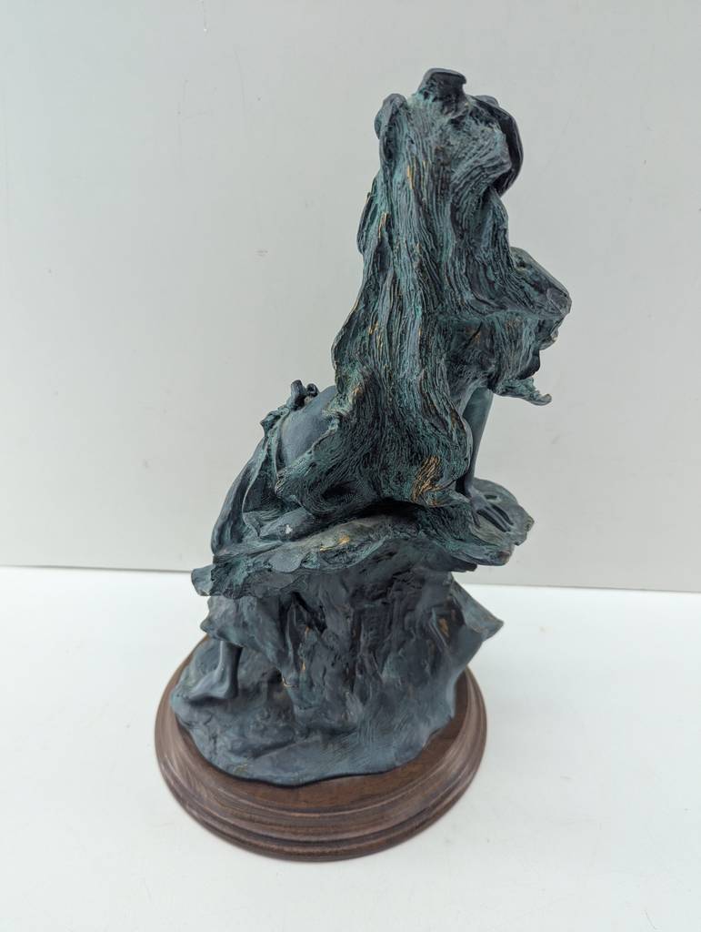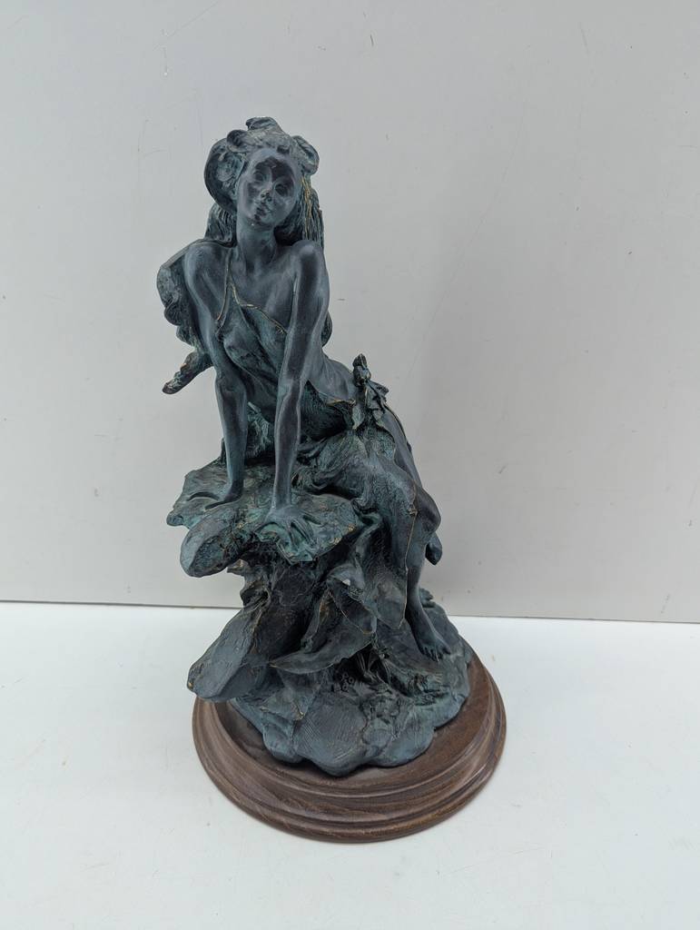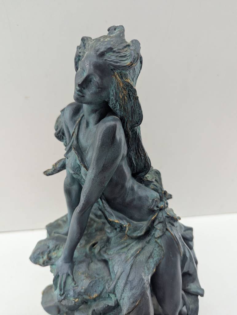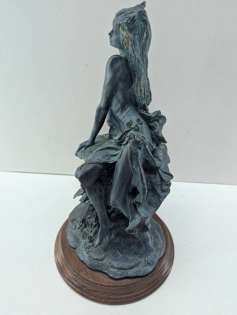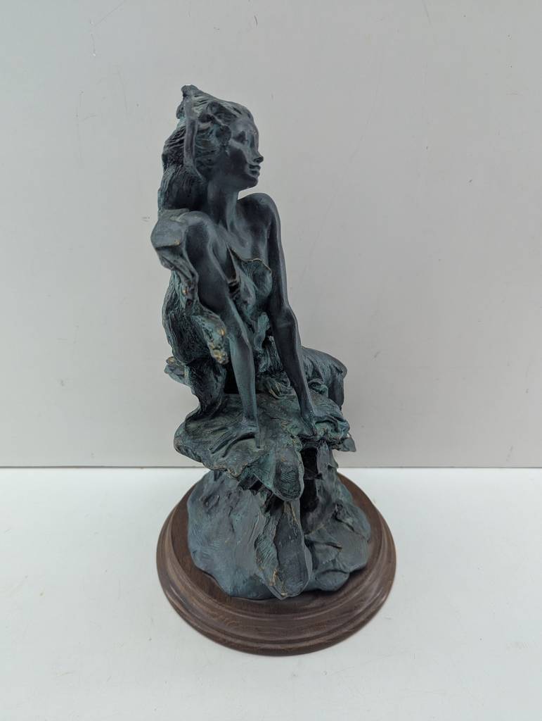 Escultura de resina de color negro con una peana redonda de color marrón oscuro. Se trata de una escultura o figura creada con resina de buena calidad que representa a una mujer de pelo largo sentada en una roca de manera sugerente. Es una figura muy bonita que resulta perfecta para colocarla en un salón comedor a modo decorativo. Como se puede observar en las fotografías se encuentra en buenas condiciones.