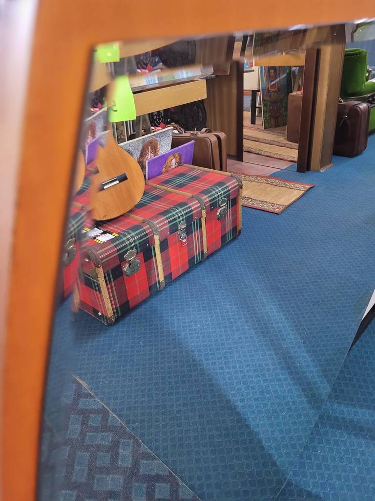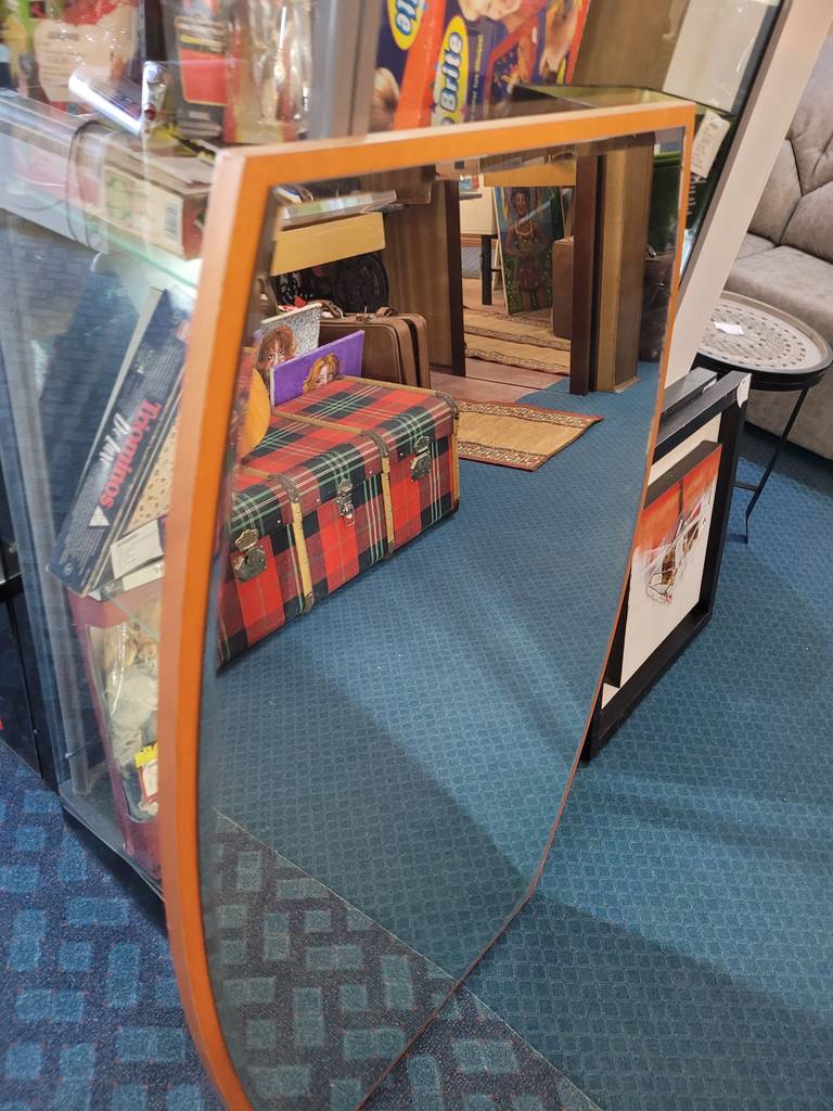 Espejo con una original forma curva que tiene una base fabricada en madera de buena calidad de color marrón claro. Se trata de un espejo vertical que tiene la parte de arriba y la de abajo rectas y los dos lados son curvos. Es un espejo perfecto para colocarlo tanto en un recibidor como en un vestidor del hogar. Como se puede observar en las fotografías se encuentra en buenas condiciones.