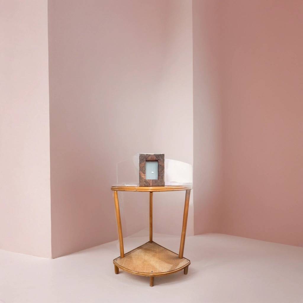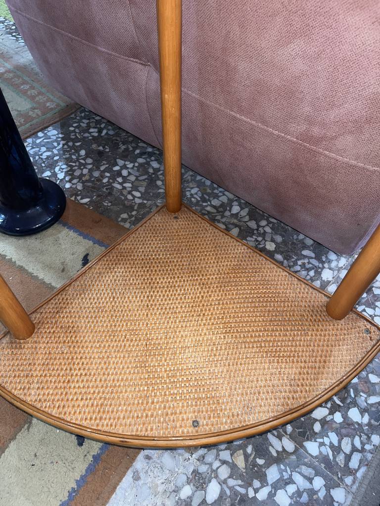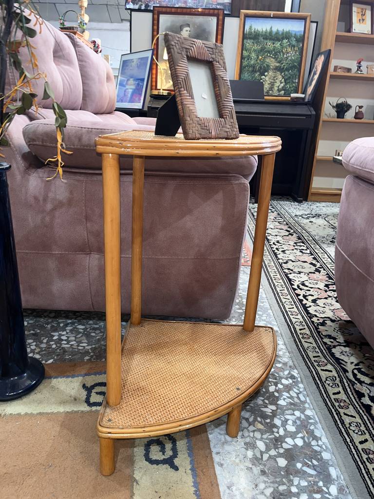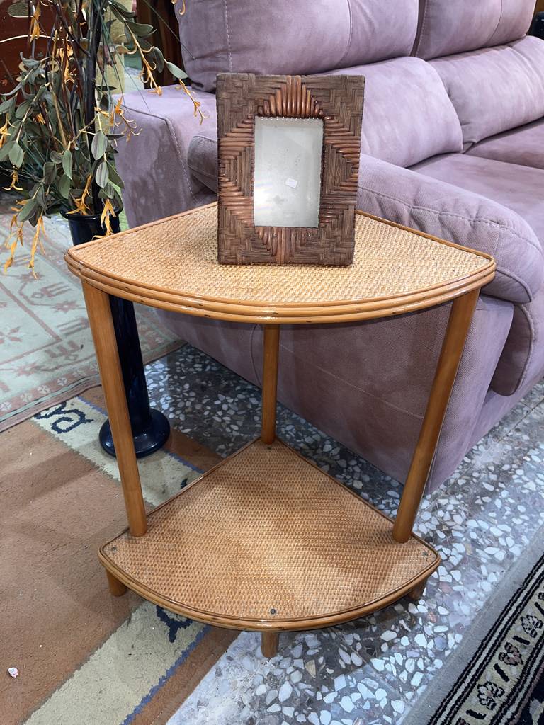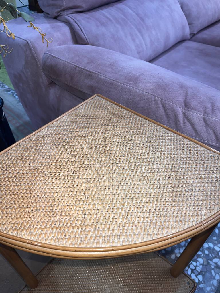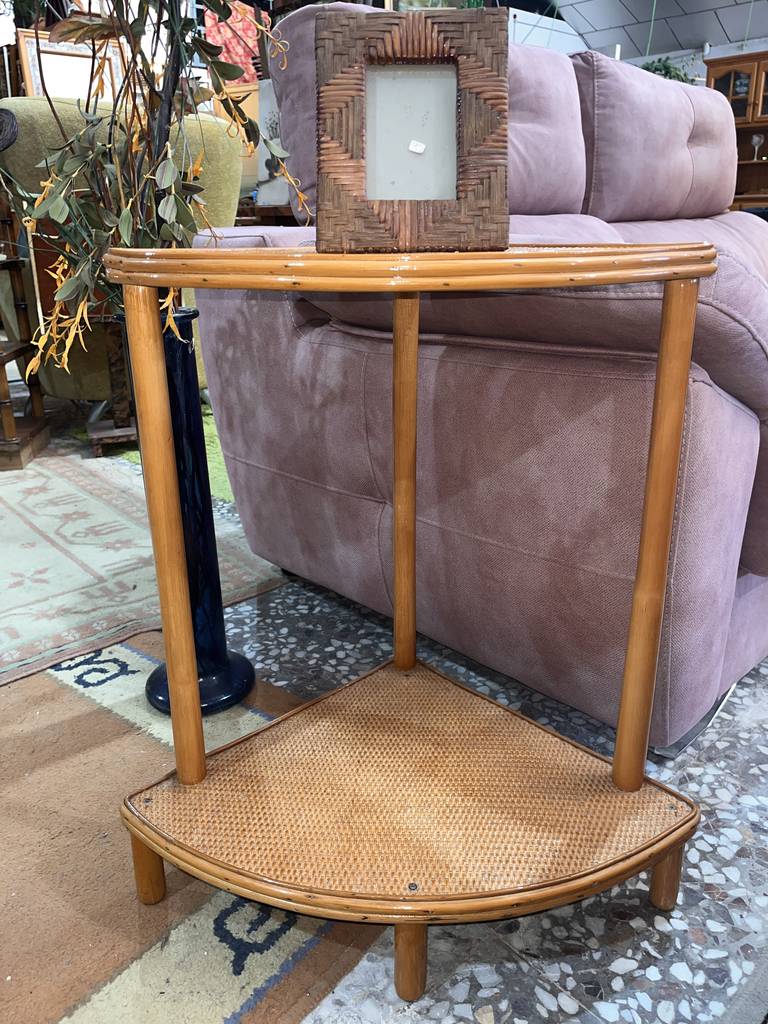 Mesa esquinera fabricada en bambú de buena calidad de color marrón claro. Se trata de una mesa esquinera que tiene dos superficies en forma de esquina unidas por listones redondos de bambú. Es una mesa esquinera perfecta para ponerla al lado de un sofá en un salón comedor. Como se puede observar en las fotografías se encuentra en buenas condiciones.