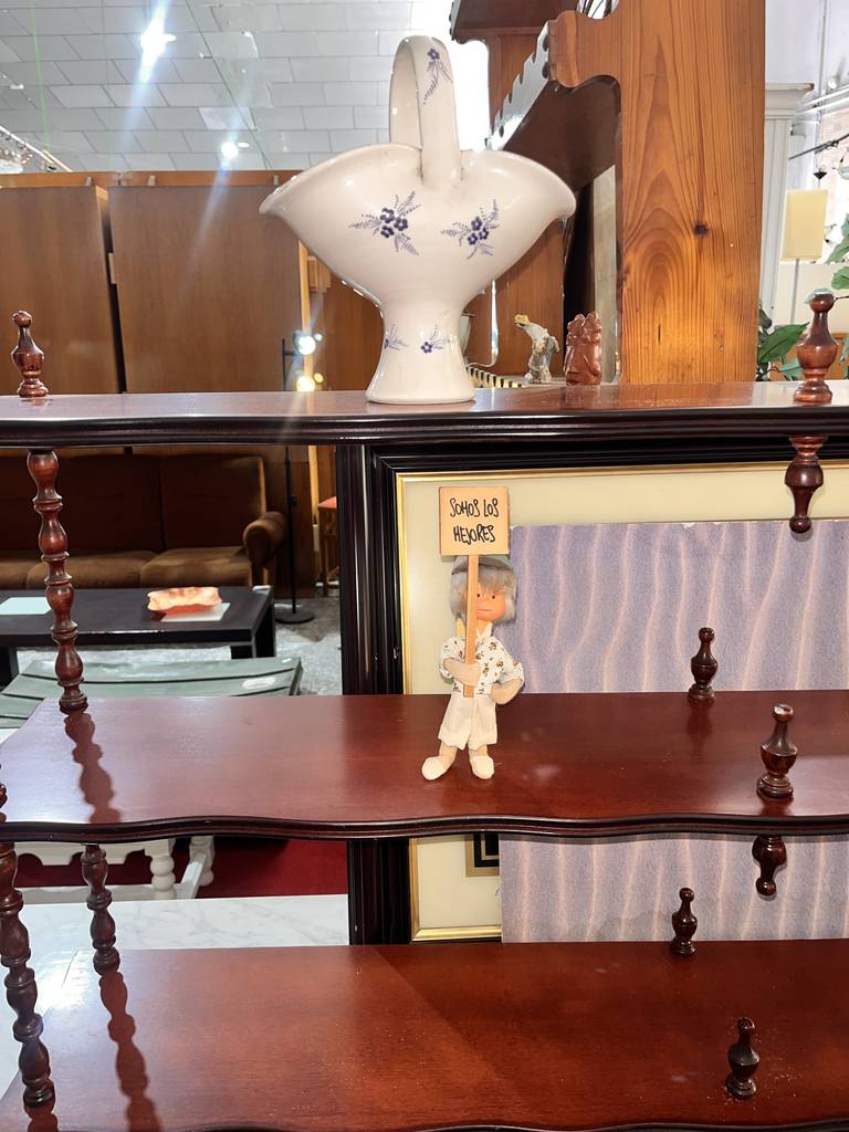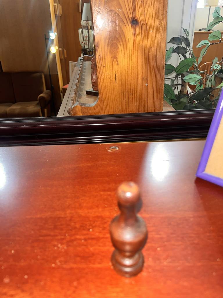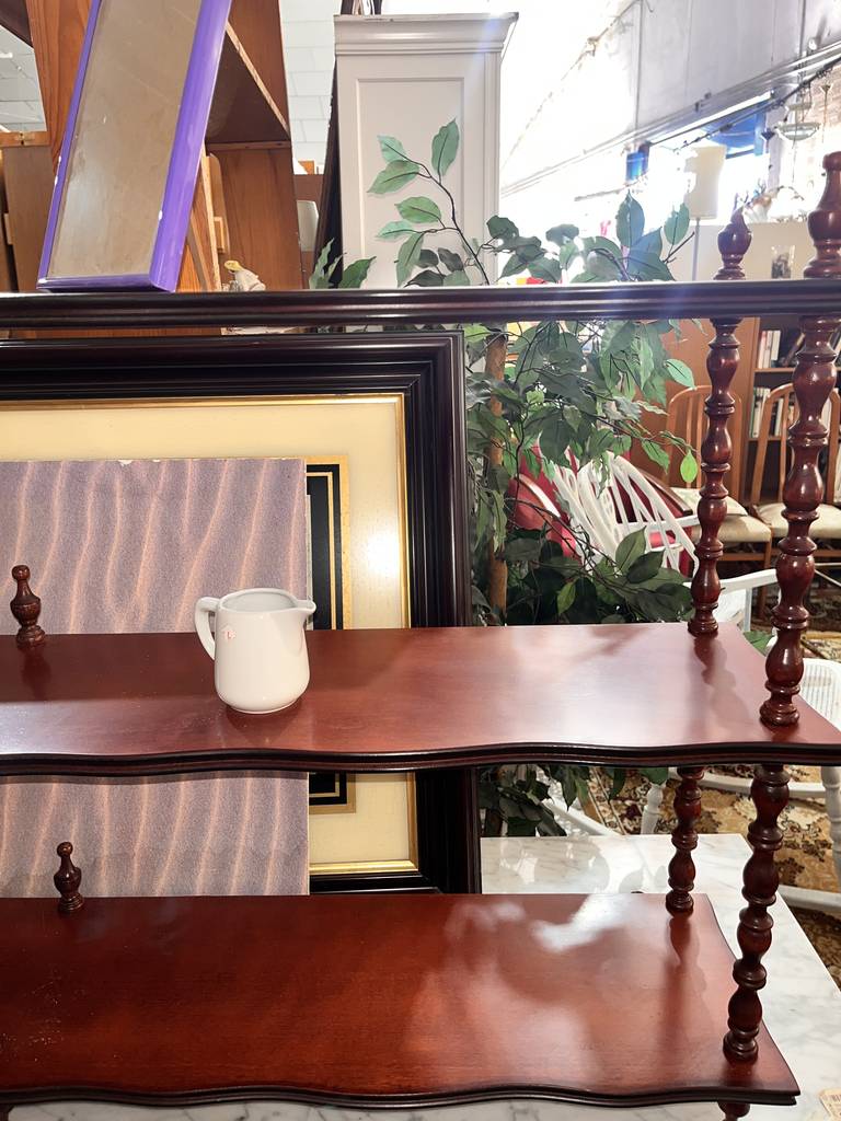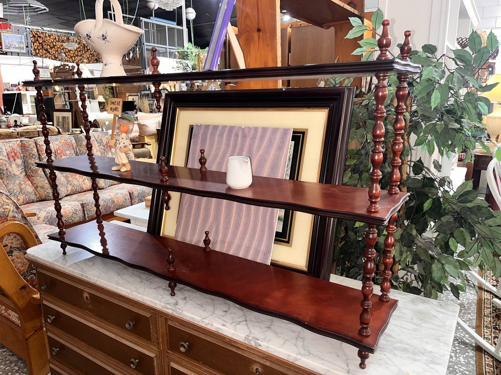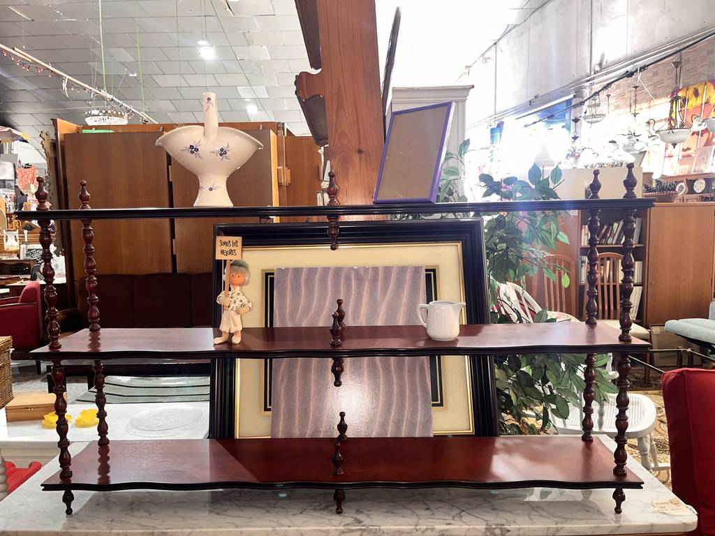 Estantería diseñada para ser colgada en pared que ha sido fabricada con madera de buena calidad y robusta. Esta estantería con un diseño clásico se compone de tres baldas rectangulares alargadas y con finas columnas redondeadas en los laterales. Es ideal para colocar en un salón comedor o en una habitación. Como podemos observar en las fotografías le falta un pequeño detalle pero en general se encuentra en buenas condiciones.