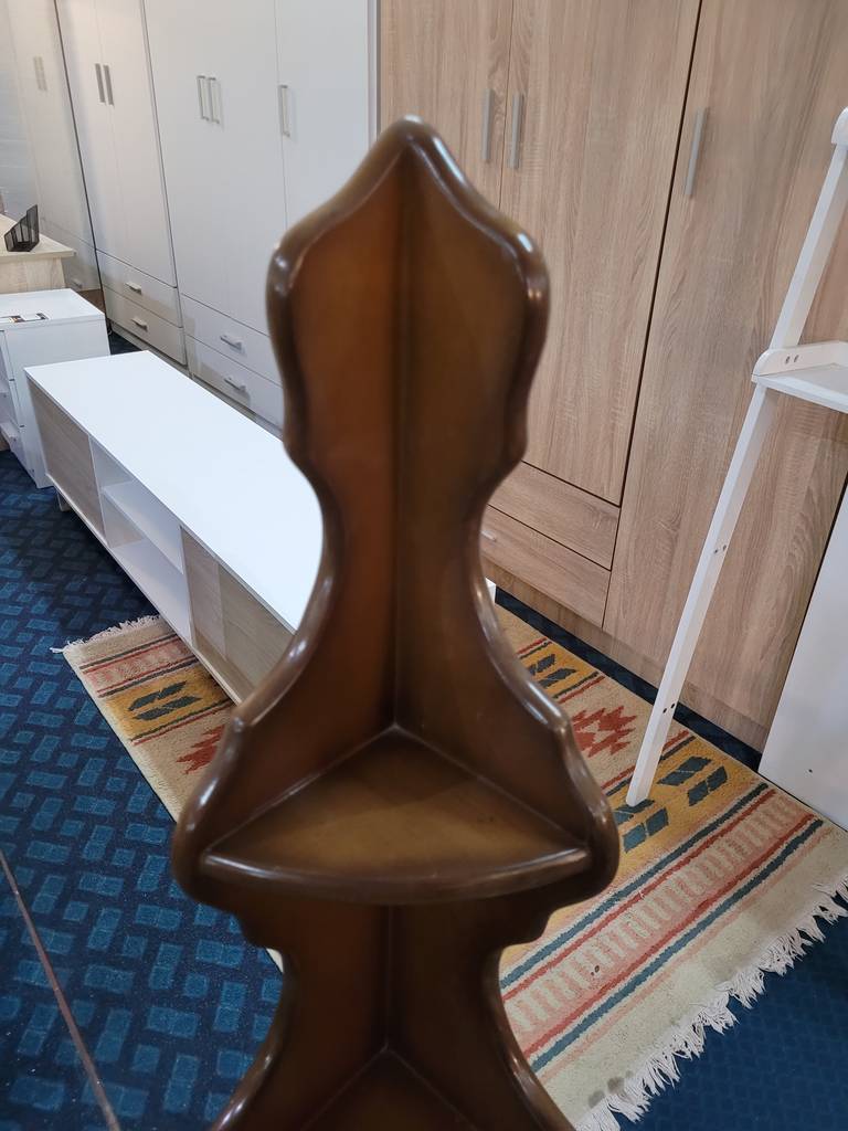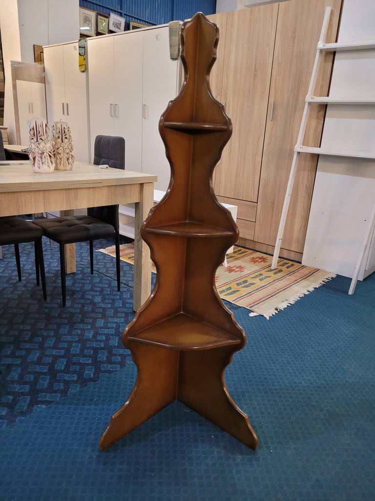 Estantería esquinera de estilo vintage fabricada en madera de buena calidad de color marrón oscuro. Se trata de una estantería que cuenta con tres repisas con forma de esquina que resulta muy práctica para colocarla en una esquina de un salón comedor. Es una estantería ideal para exponer figuras. Como se puede ver en las imágenes está en buenas condiciones.