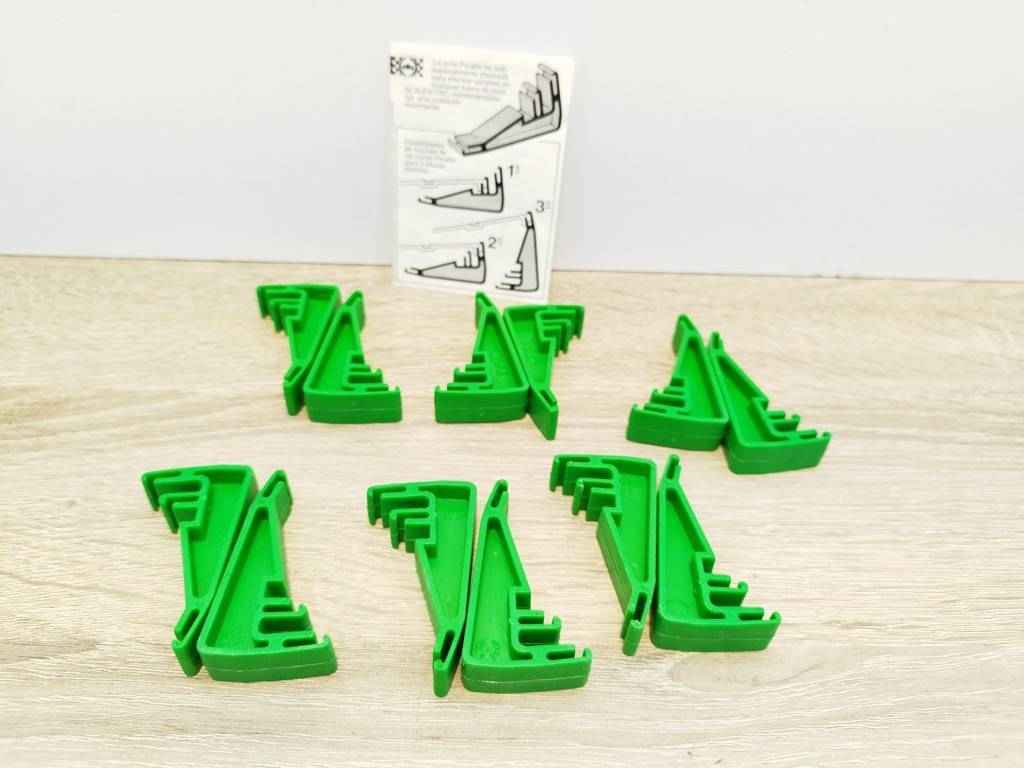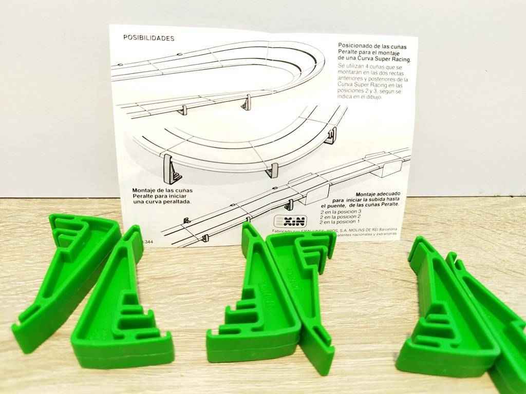 Caja de 12 cuñas de soporte para pistas de circuitos EXIN. Se encuentran en perfectas condiciones, ya que son nuevas a estrenar. Son de la marca EXIN Ref.8511. Con ellas podremos elevar pistas y también crear curvas Super Racing. Son perfectas para sustituir tus antiguas cuñas y también para tener de repuesto.