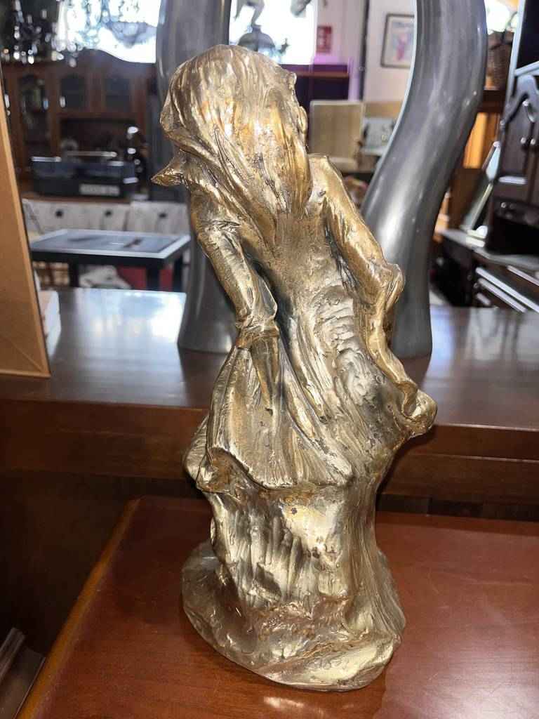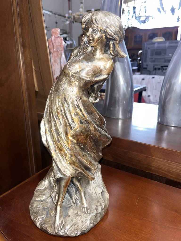 Figura muy bonita y original fabricada en resina de buena calidad. Se trata de una figura de una mujer vestida con un largo traje y con la mano derecha sujetándoselo. Es una figura ideal para un recibidor o un salón comedor y, con ello, resaltar nuestra estancia aportándole un toque único. Como podemos observar en las fotografías presenta desgaste.