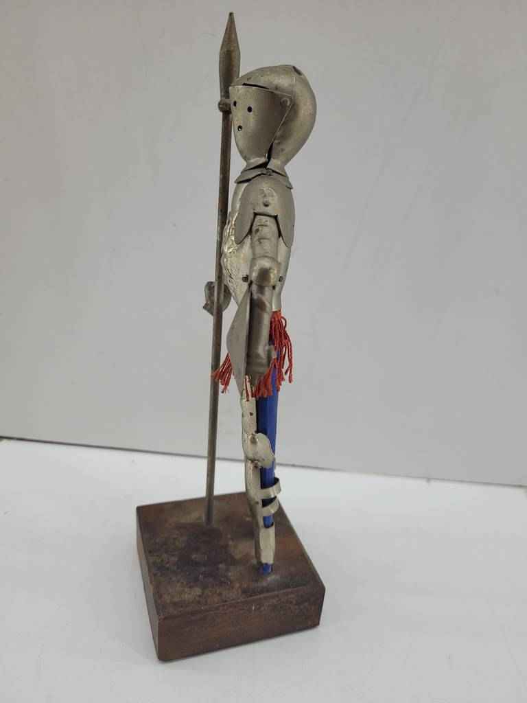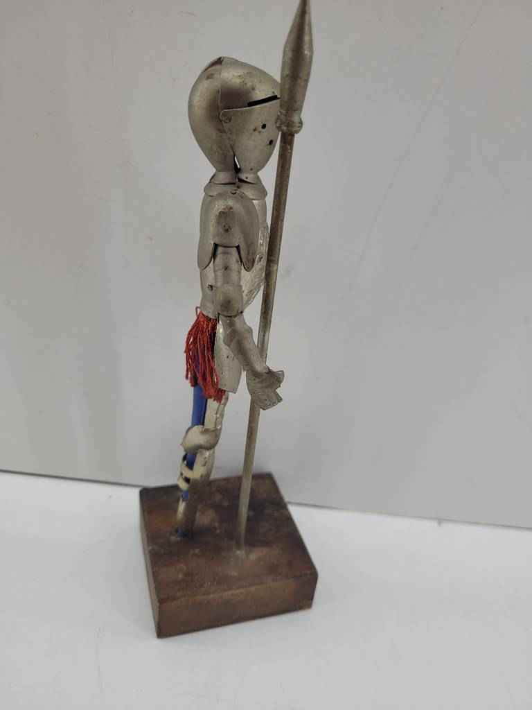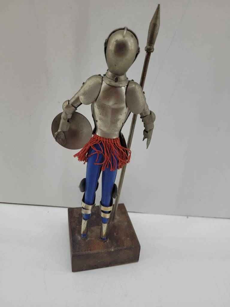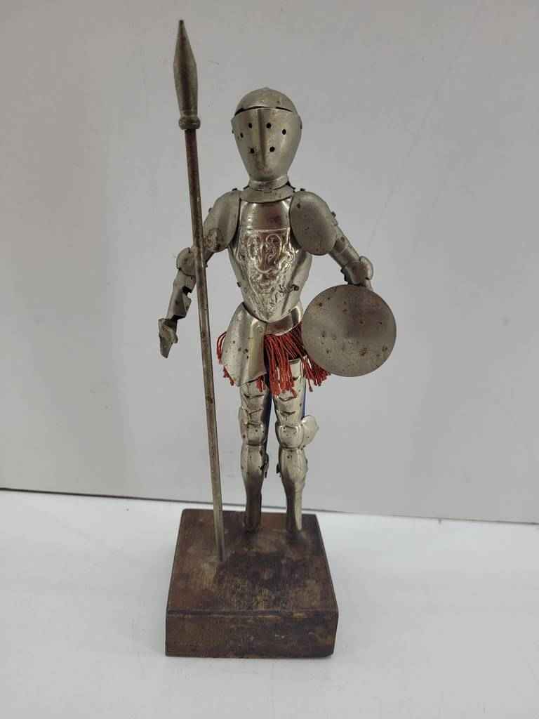 Figura de soldado con armadura antigua. Se trata de una figura que representa a un soldado de otra época que lleva una corpulenta armadura, además de un escudo y una gran lanza. La figura es de pequeño tamaño y dispone de una base de madera de forma cuadrada que asegura su estabilidad. Como se puede observar en las fotografías se encuentra en buen estado.