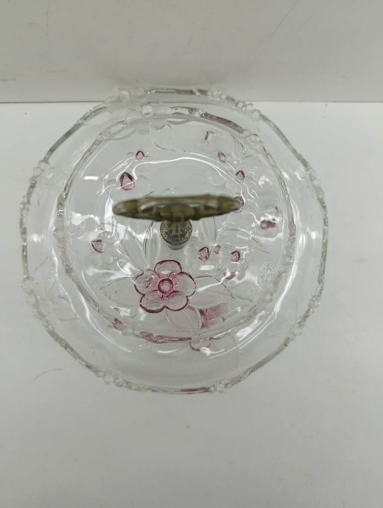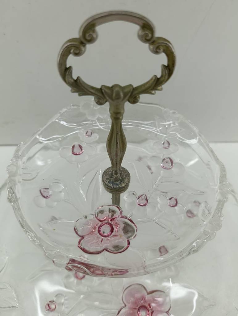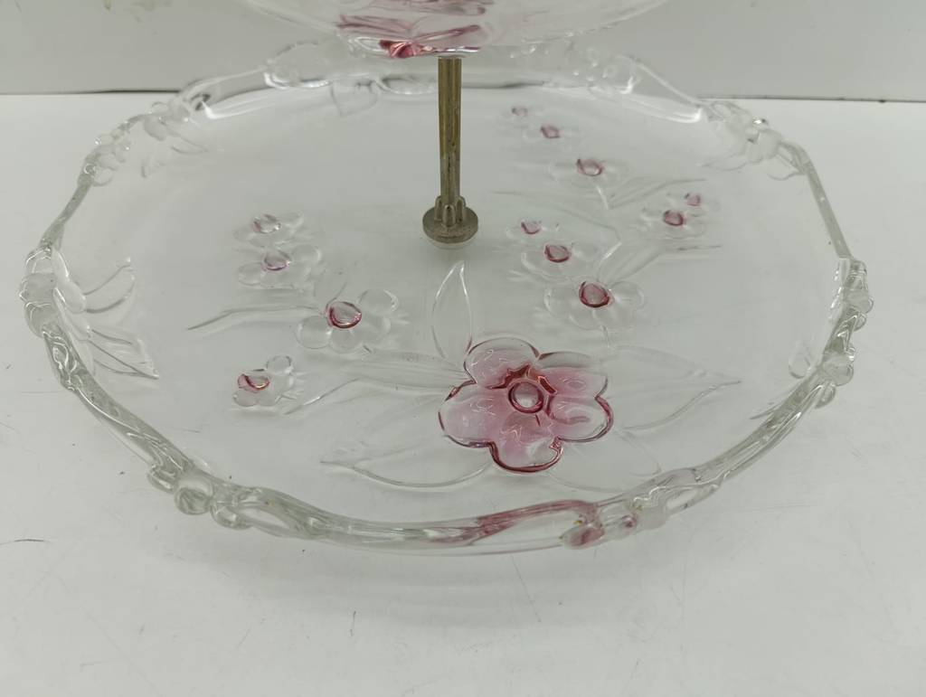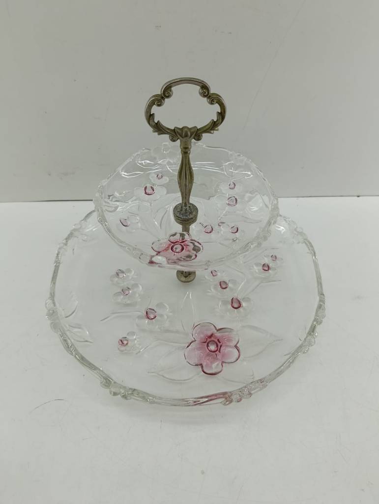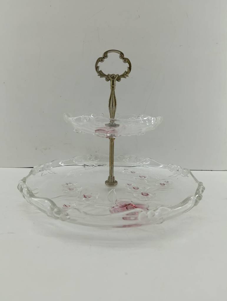 Frutero o expositor de dos pisos fabricado en cristal grueso de buena calidad de color dorado y transparente. Se trata de un frutero o un expositor que cuenta con una estructura central dorada y tiene dos platos en forma de pisos, uno más grande que el otro. Es un frutero ideal para ponerlo en una cocina o en un salón comedor. Como se puede observar en las fotografías se encuentra en buenas condiciones.