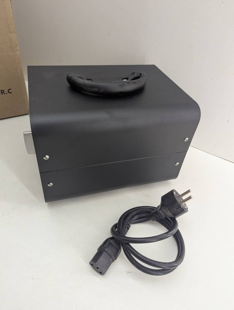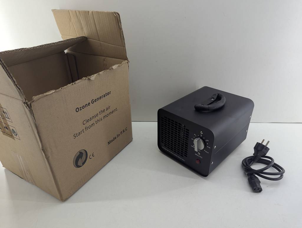 Generador de ozono de la marca Ozonovid de color negro. Se trata de un generador de ozono que viene en su caja original y cuenta con un enchufe para poder conectarlo a la corriente y tiene un interruptor para programar los minutos que queramos dejarlo encendido. Como se puede observar en las fotografías se encuentra en buenas condiciones y funciona correctamente.
