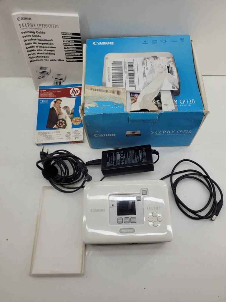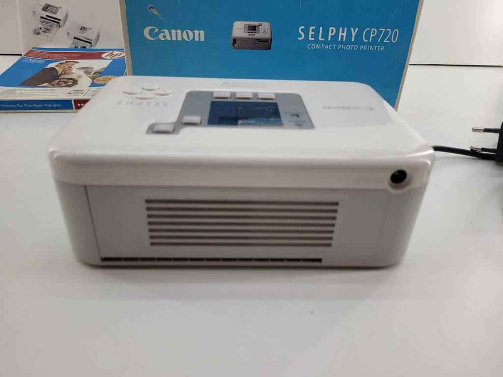 Impresora fotográfica compacta de la marca CANON modelo SELPHY CP720. Se trata de una impresora ideal para imprimir fotografías intensas, vivas y con alta calidad de archivo. Se encuentra completa con su caja, cables e instrucciones. Aprovecha esta oportunidad de imprimir tus fotos en la más alta calidad. Como podemos observar en las fotografías se encuentra en buenas condiciones.