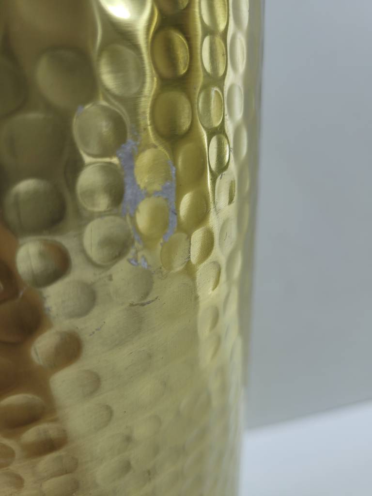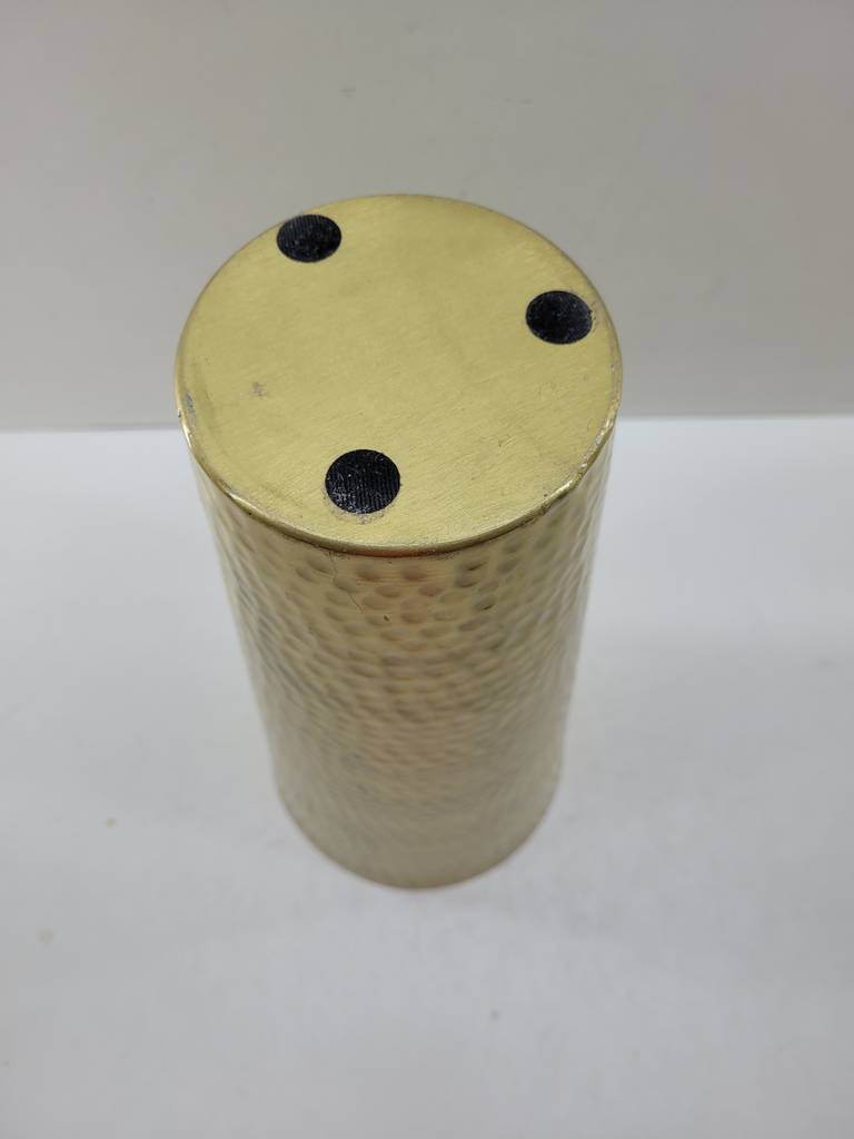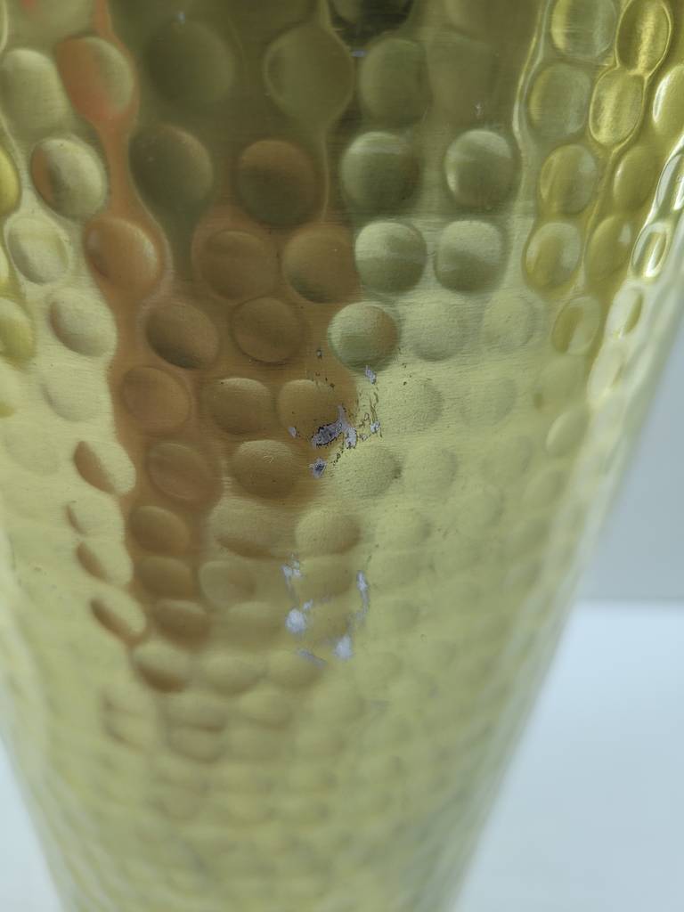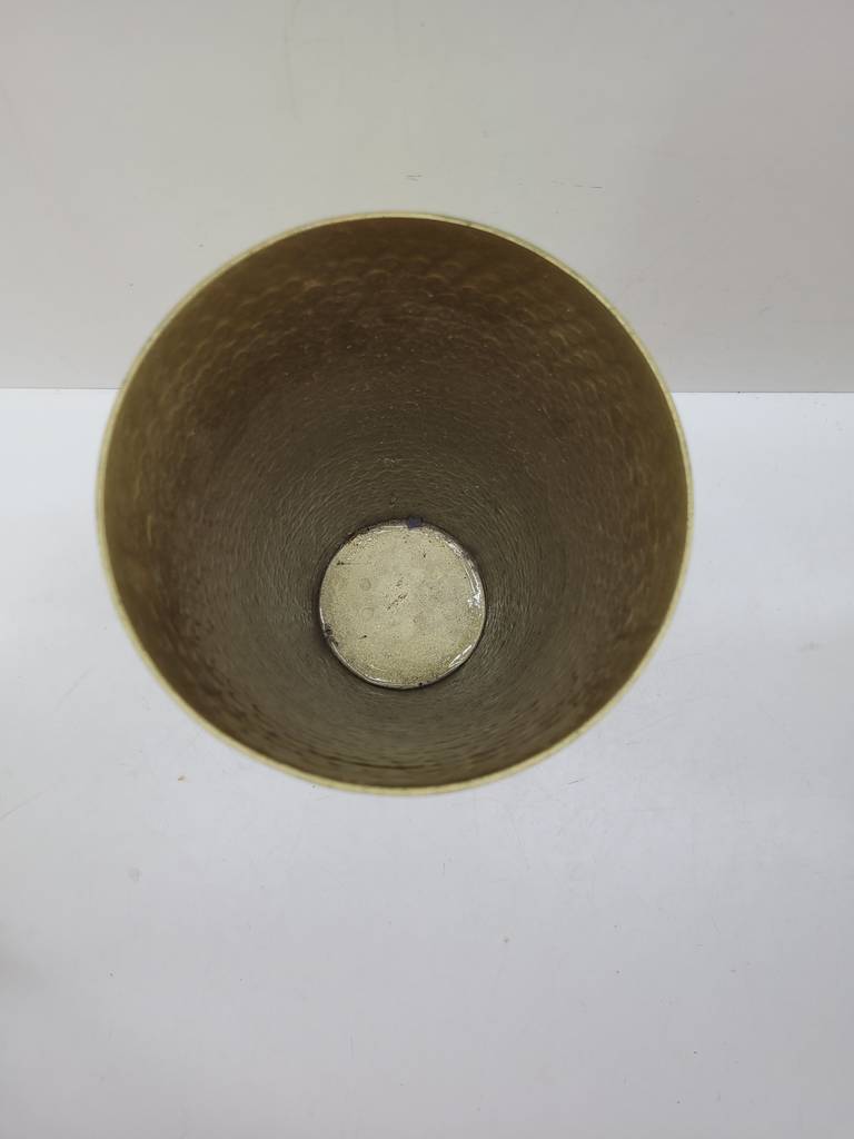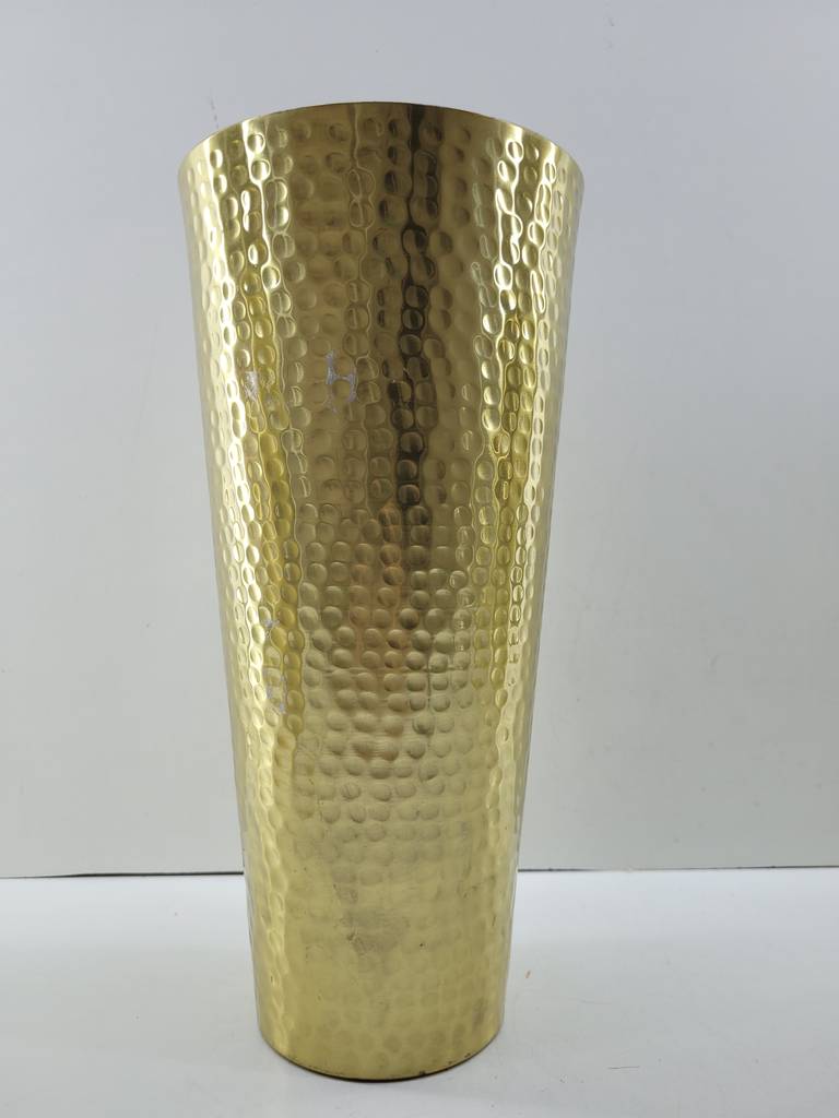 Jarrón fabricado en metal de buena calidad de color dorado. Se trata de un jarrón de tamaño mediano que tiene una forma cilíndrica donde la base es algo más estrecha y se ensancha hacia la parte de arriba. Es un jarrón muy bonito que resulta perfecto para poner dentro flores y colocarlo en un salón comedor. Como se puede observar en las fotografías se encuentra en buenas condiciones.